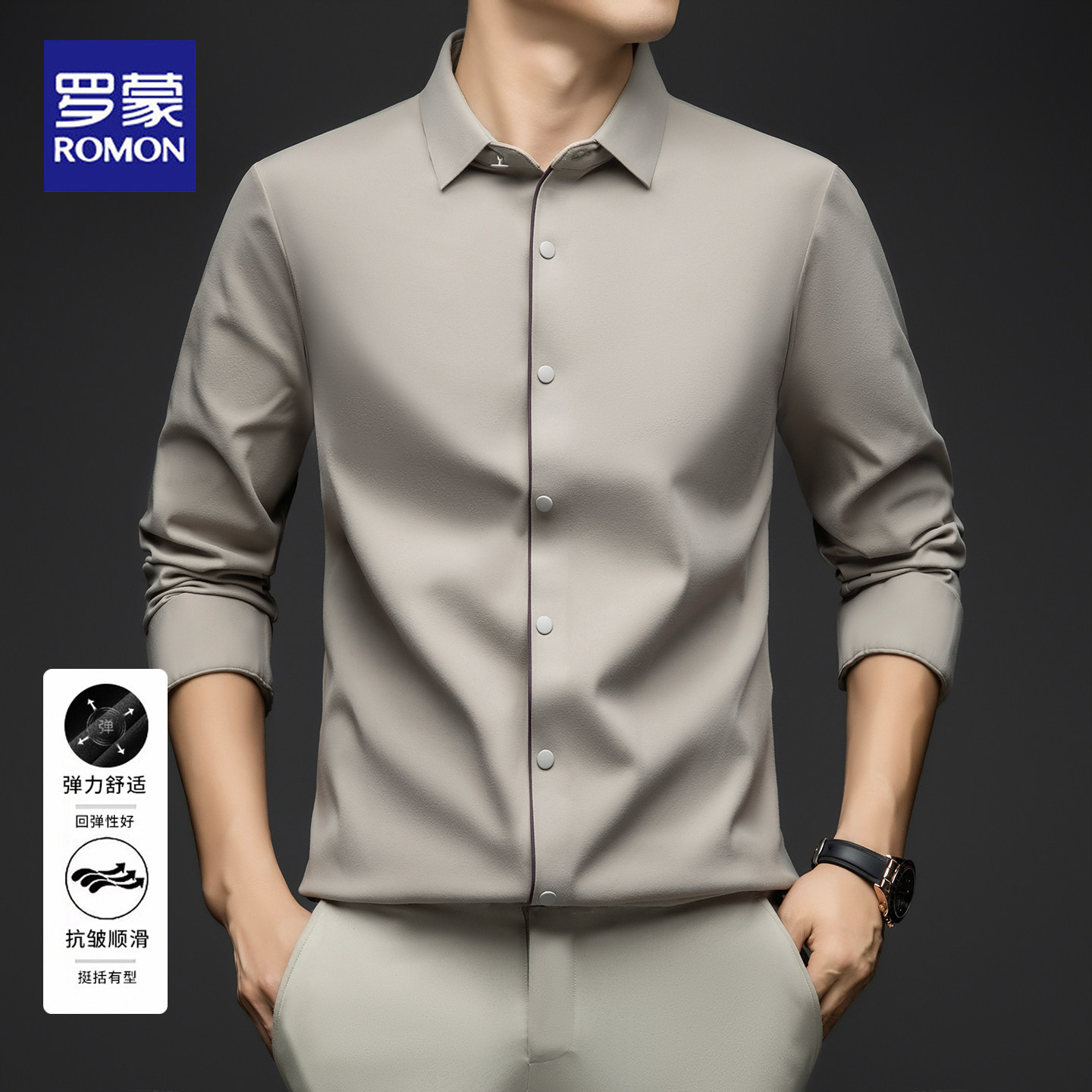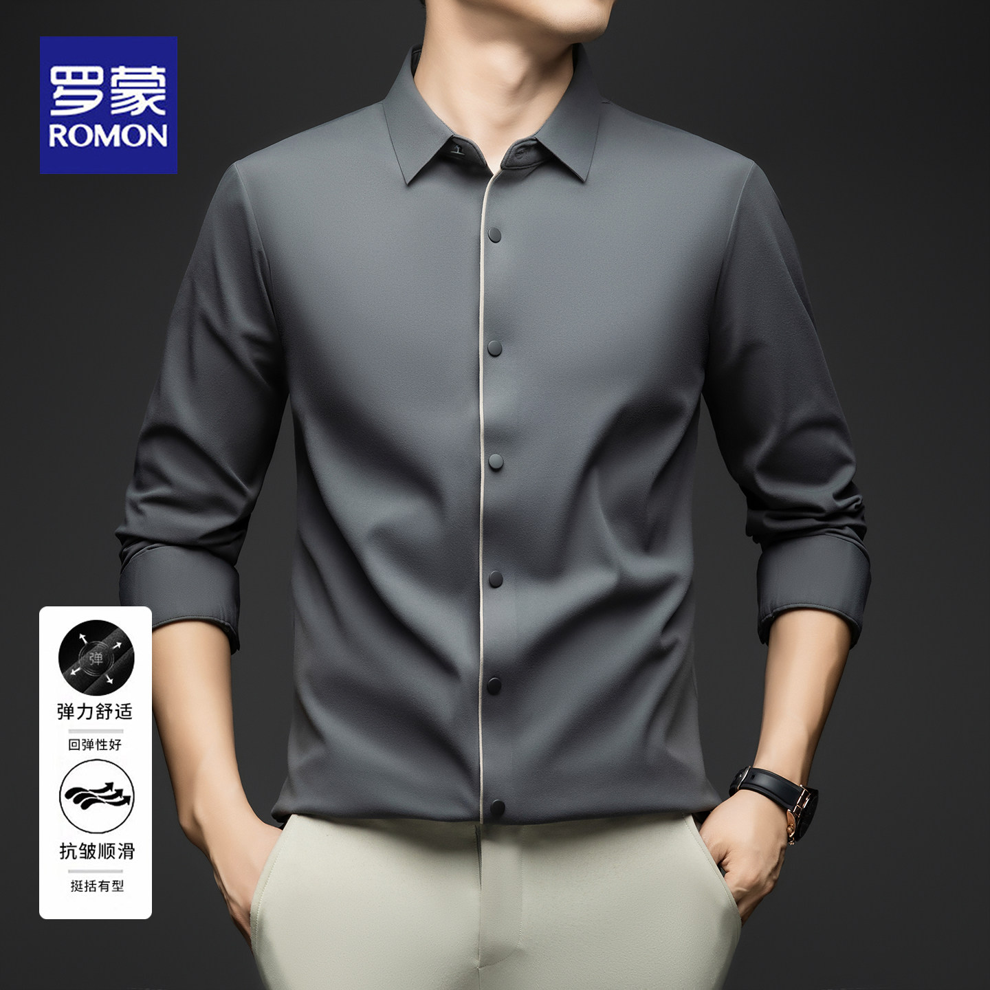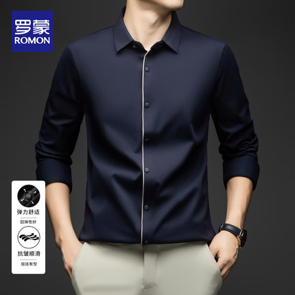 罗蒙2025新款男士长袖衬衫春秋款商务休闲锦氨无痕免烫弹力衬衣男
