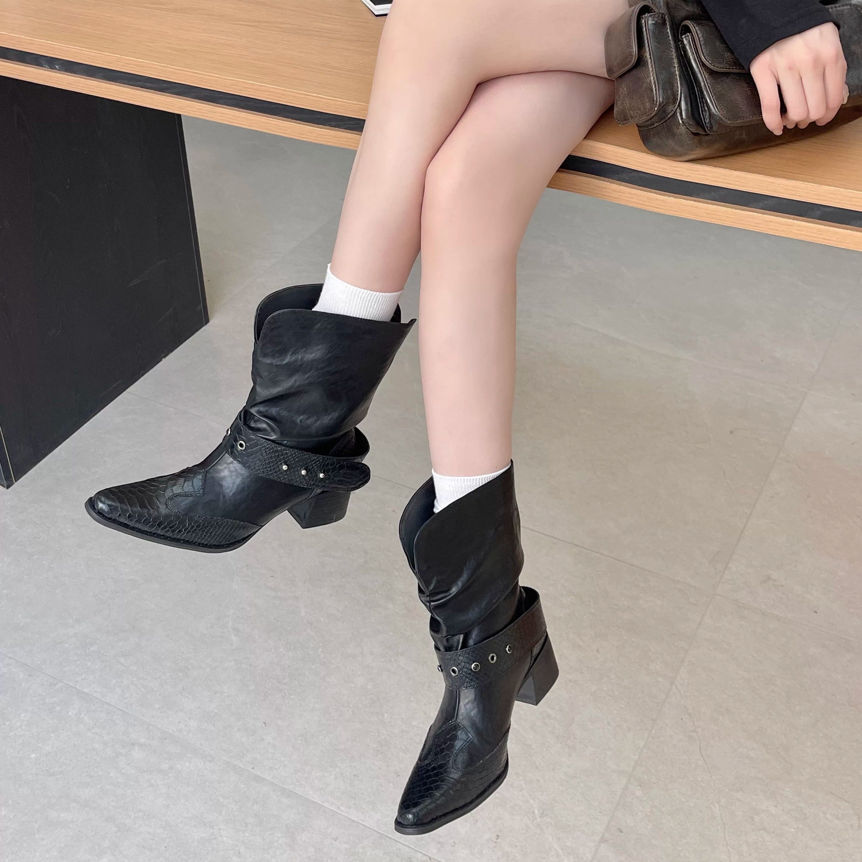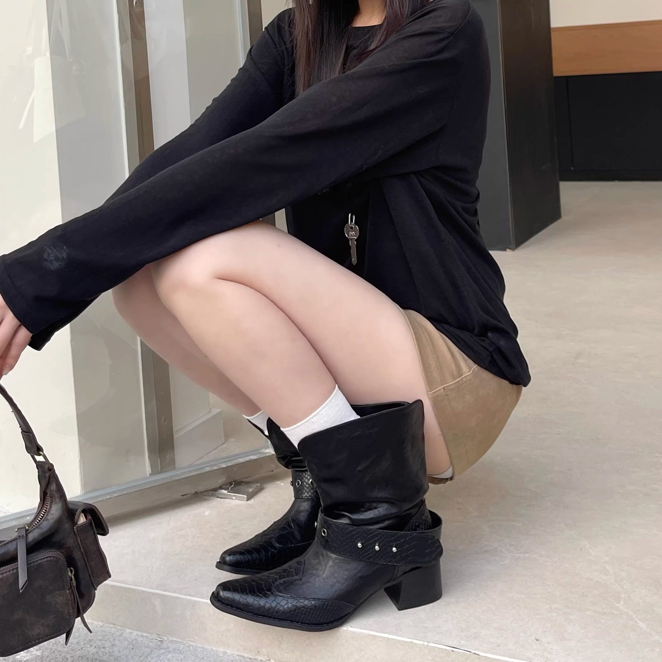 复古尖头皮带扣短靴女2026春夏新款粗跟显瘦机车靴小众时尚马丁靴