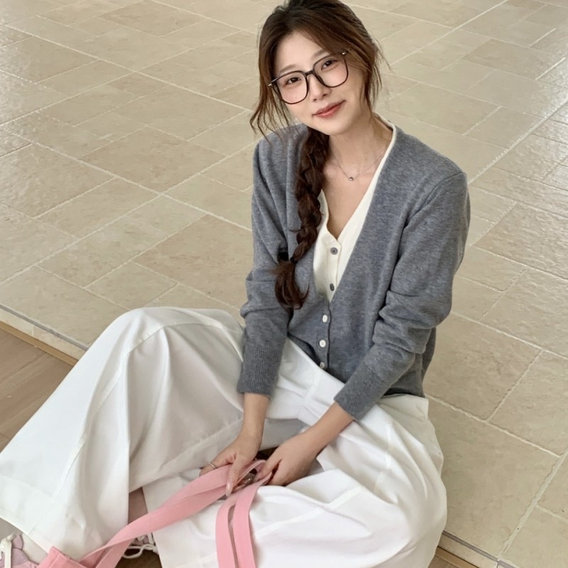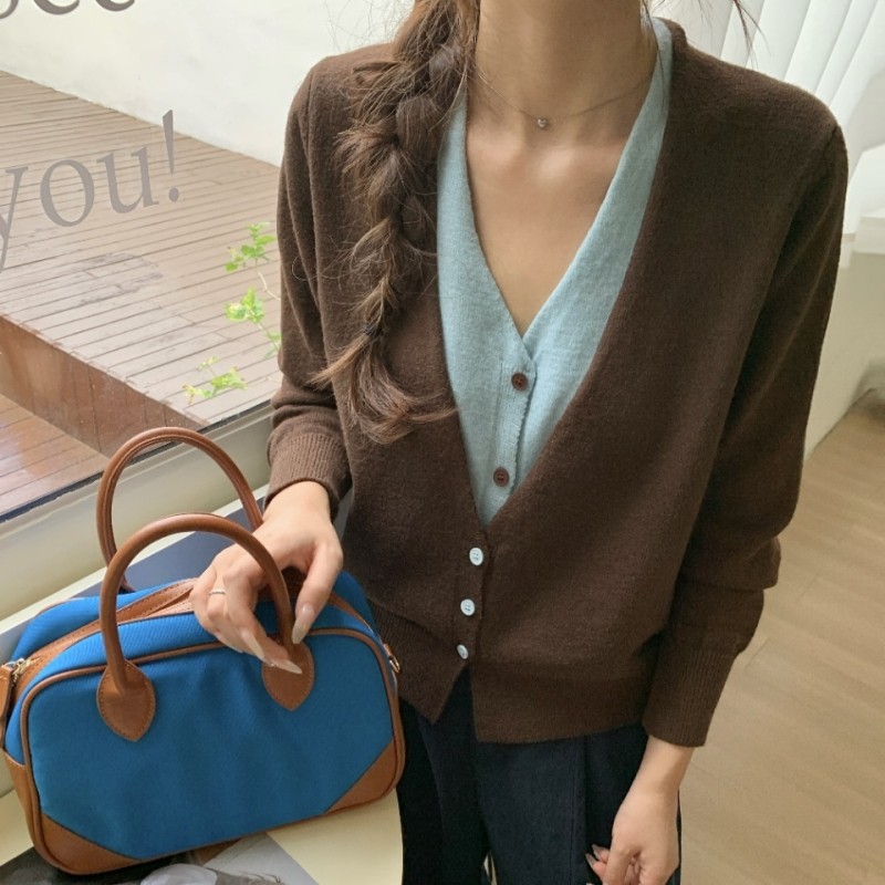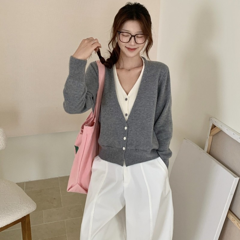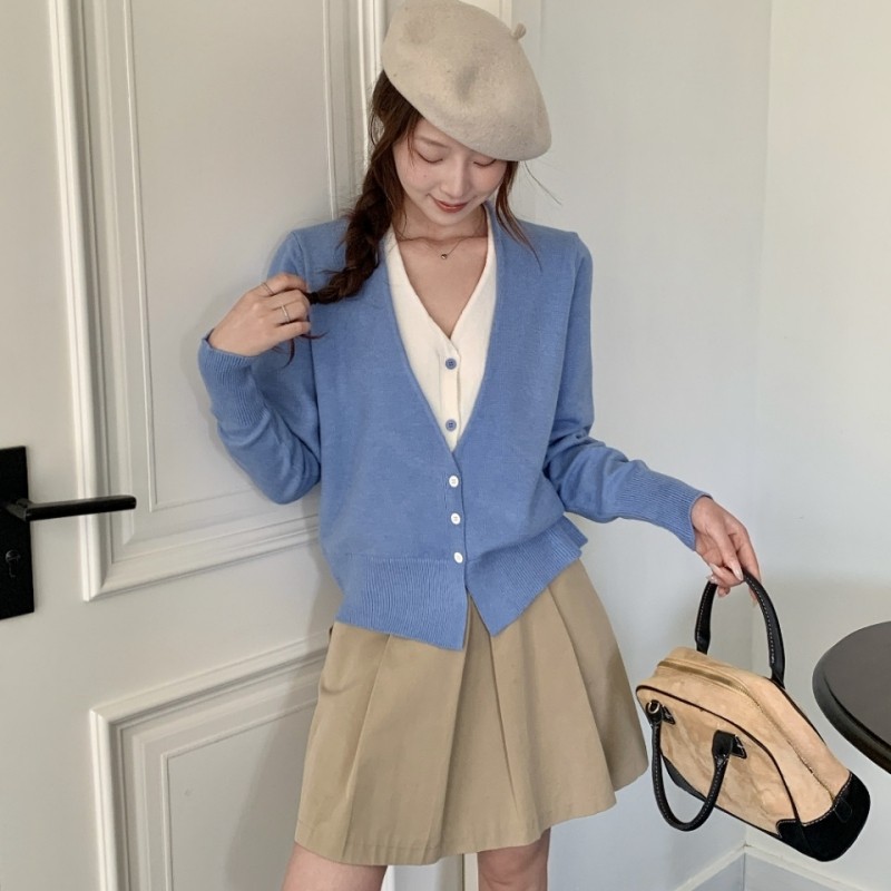 新款拼接假两件V领针织开衫2025秋冬韩系宽松上衣女毛衣短款外套