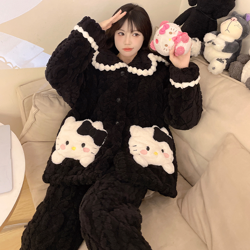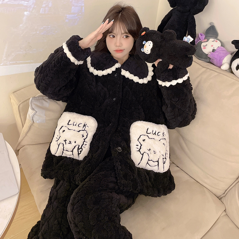 三层夹棉珊瑚绒睡衣女冬季加厚绒法兰绒网红风卡通可爱家居服套装