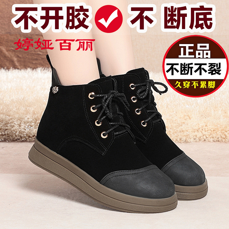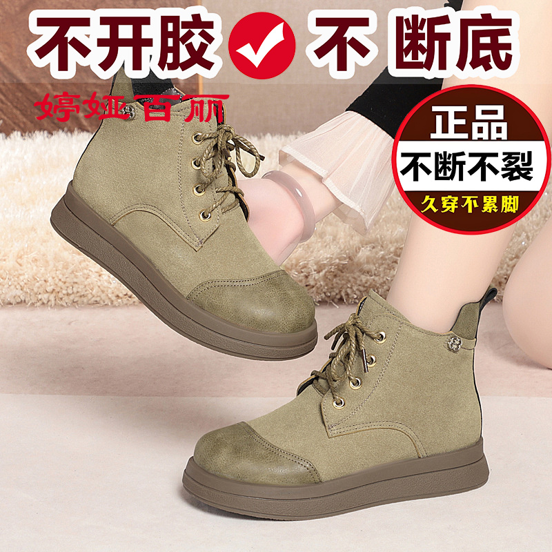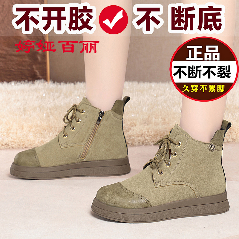 婷娅百丽2025软底秋冬新款高帮马丁靴软皮单靴绵羊毛一体棉靴圆头