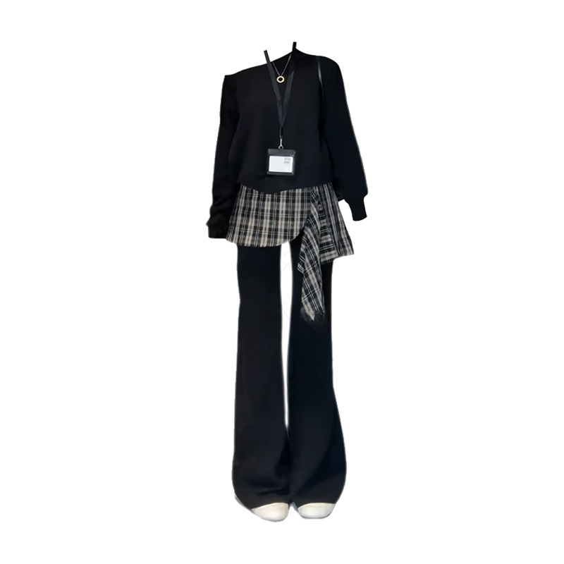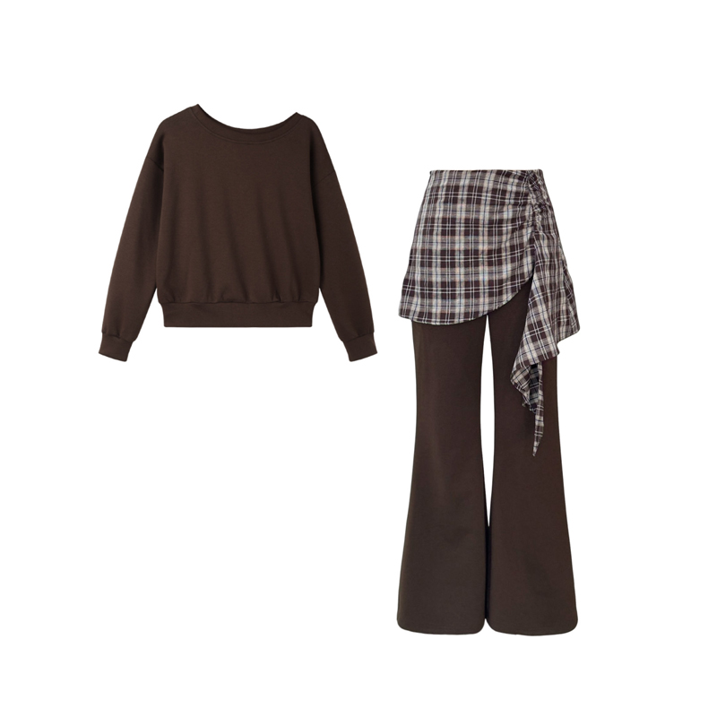 法式复古格纹不规则斜肩卫衣女韩系早秋穿搭高腰假两件微喇裤