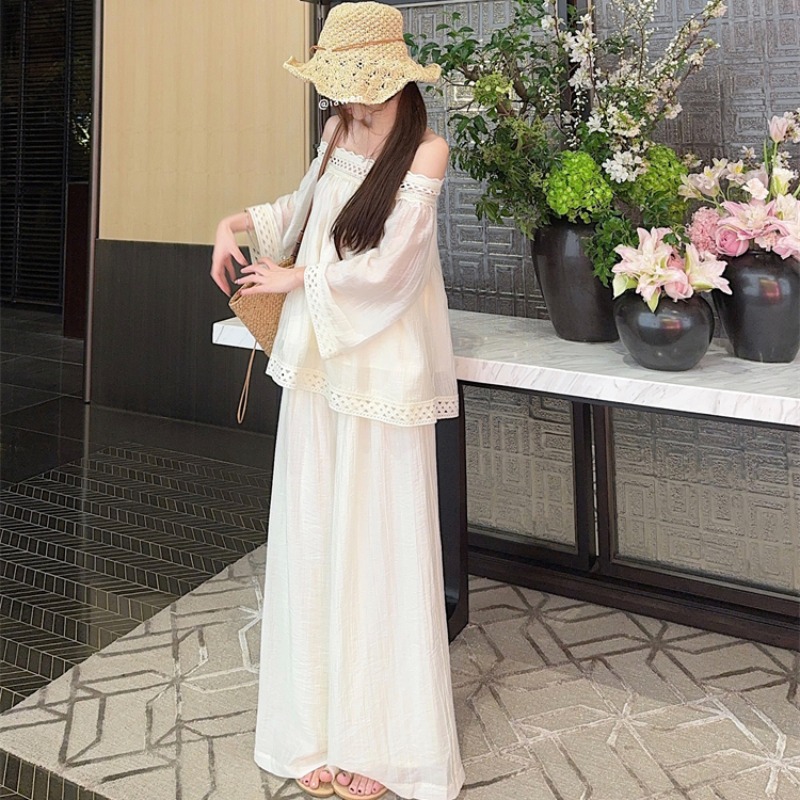胖mm韩系气质通勤镂空花边一字肩宽松上衣女高腰阔腿裤休闲两件套