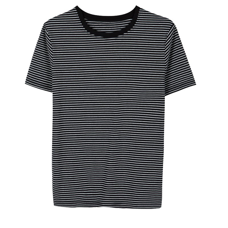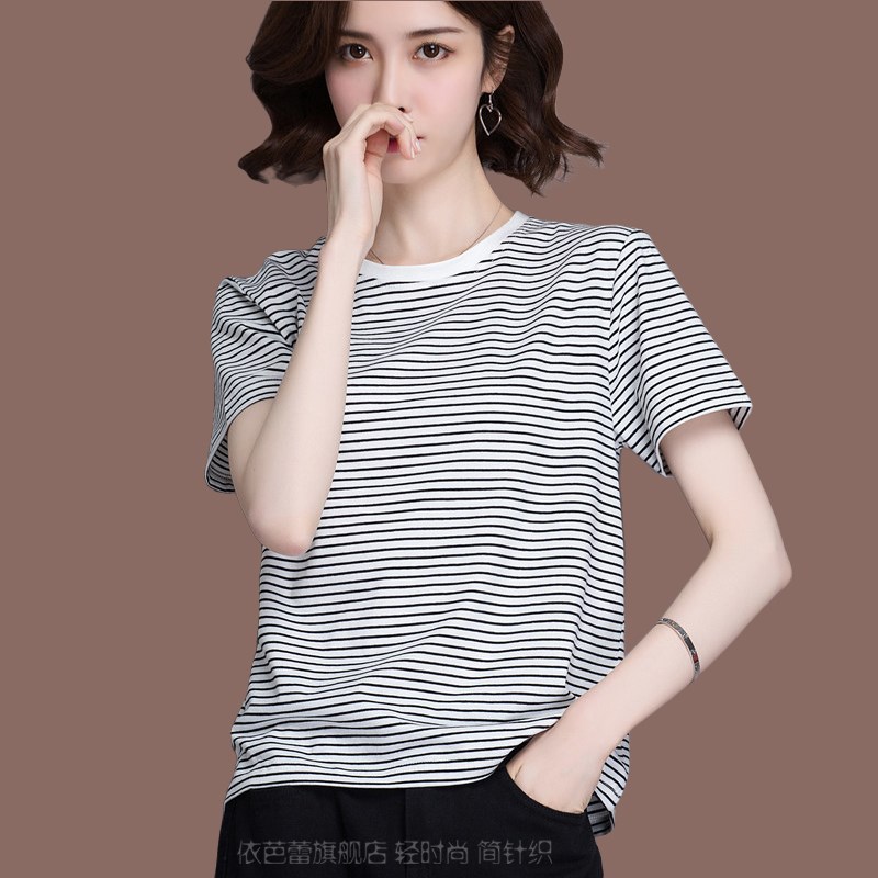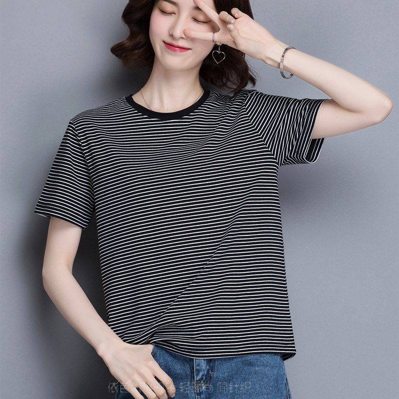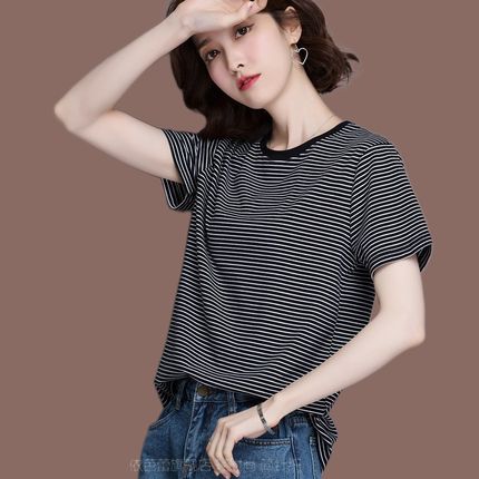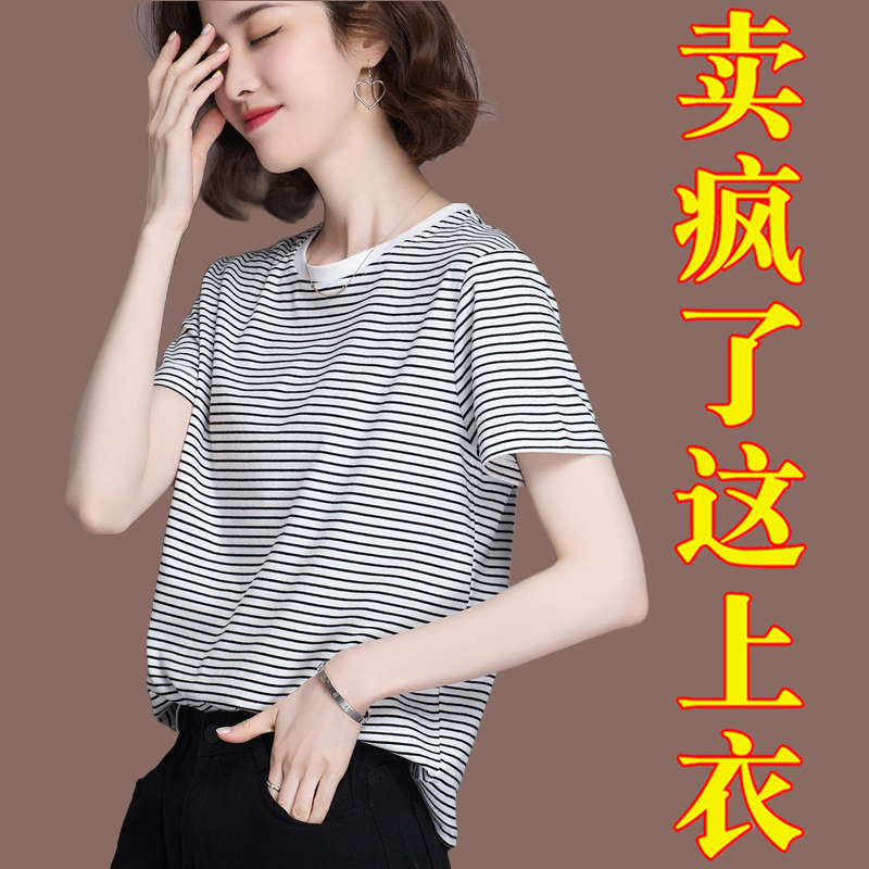 夏季黑白条纹t恤女纯棉妈妈短袖宽松妈妈全棉短款黑色打底丅体桖