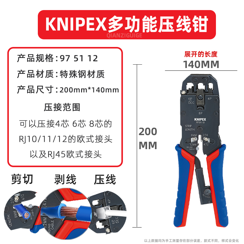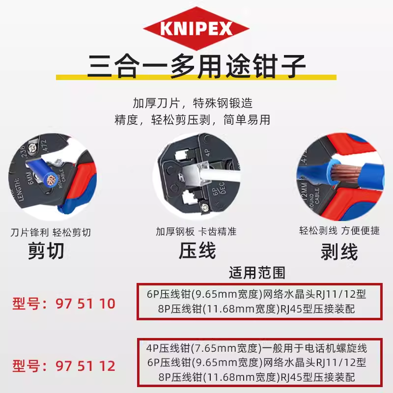 德国凯尼派克KNIPEX网线压线钳宽带电话水晶头网线钳975112 97 51