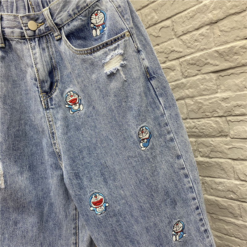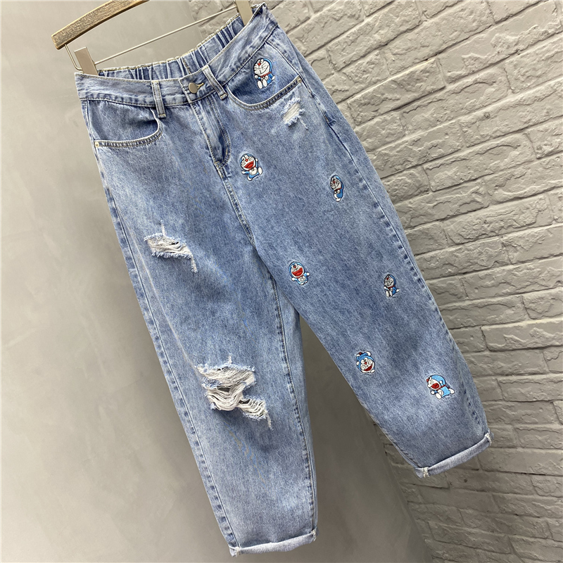 300斤特大码女装胖mm垮裤刺绣薄款破洞宽松高腰九分哈伦牛仔裤女