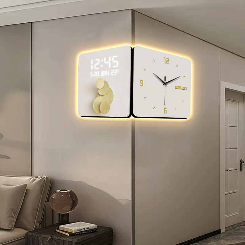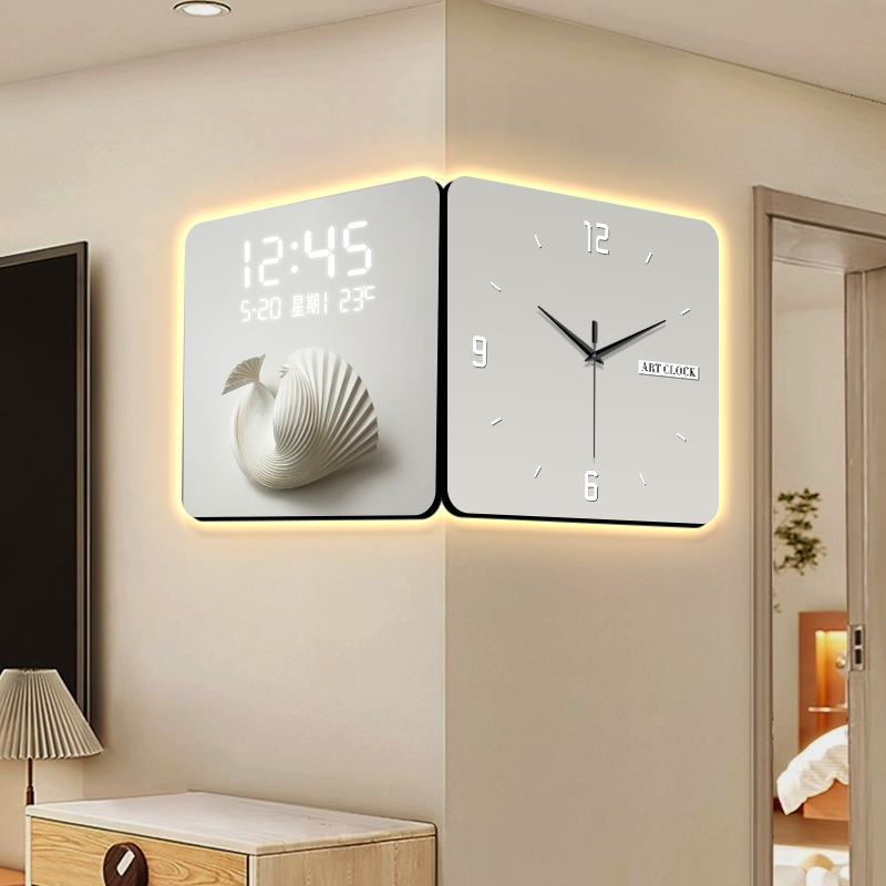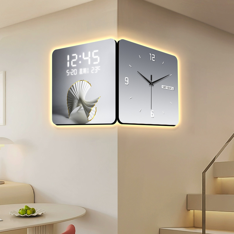 双面转角钟表挂钟现代简约折纸客厅走廊拐角壁画创意电子时钟壁灯
