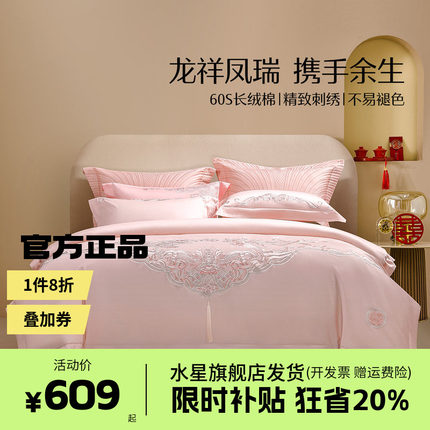 水星家纺60S长绒棉全棉纯棉床上用品龙凤之舞结婚婚庆被套床单粉
