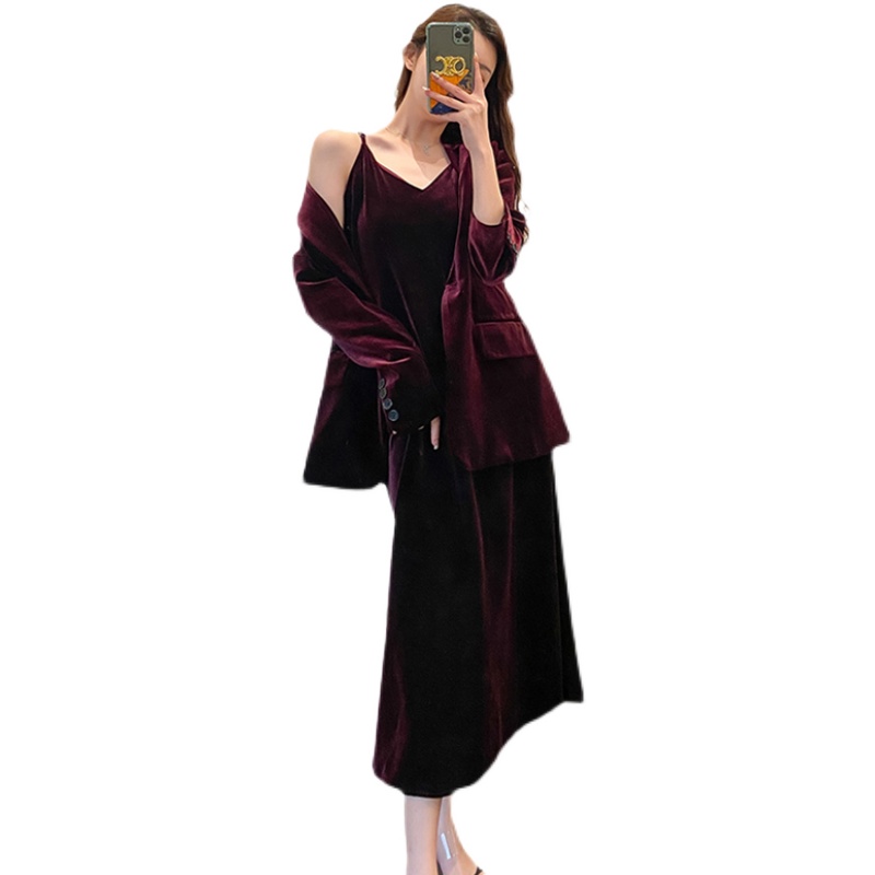 丝绒西服套装女大码胖mm西装吊带连衣裙两件套高端轻奢大牌显瘦