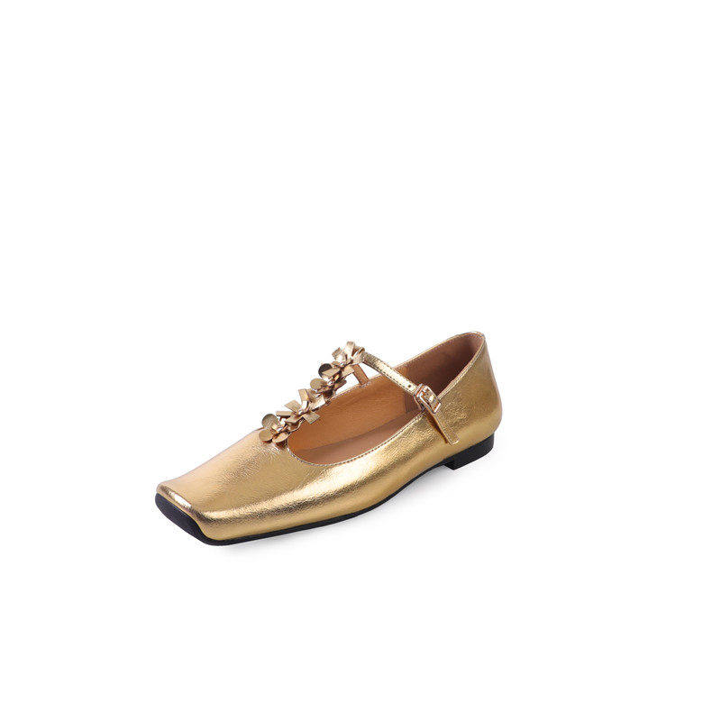 名媛风水钻花朵T型扣带法式绝美玛丽珍鞋方头平底真皮银色单鞋女