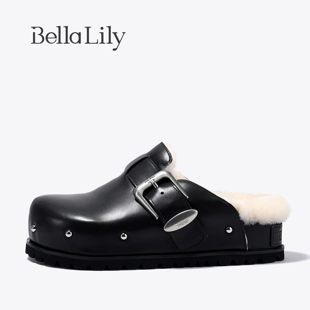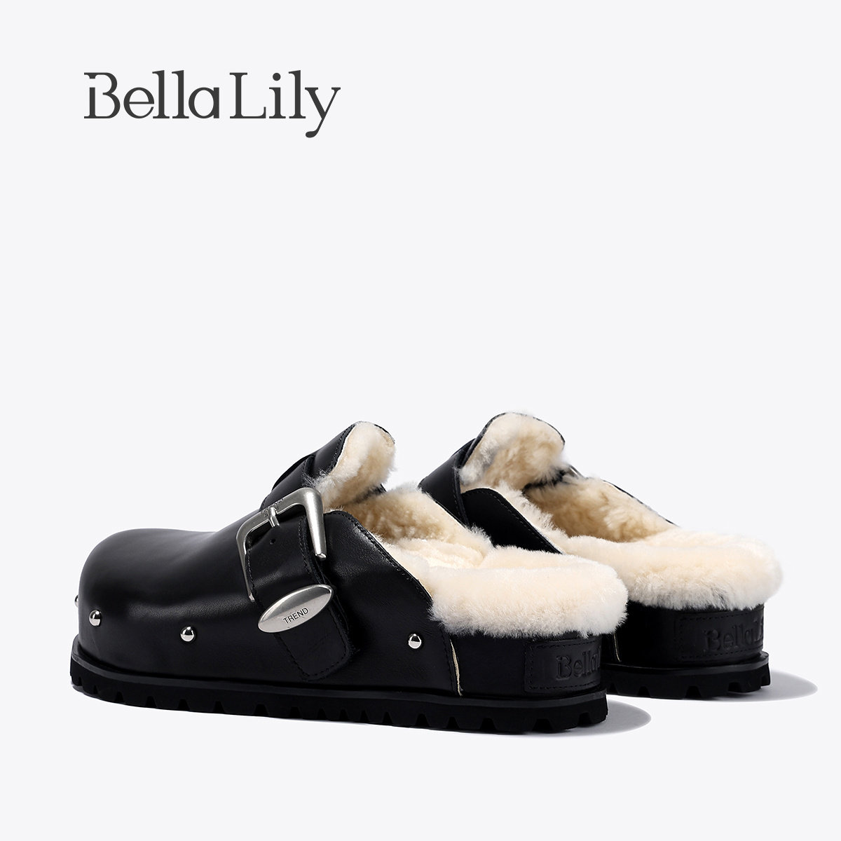 BellaLily2025秋季新款加绒羊毛半包拖鞋女毛毛拖厚底牛皮勃肯鞋