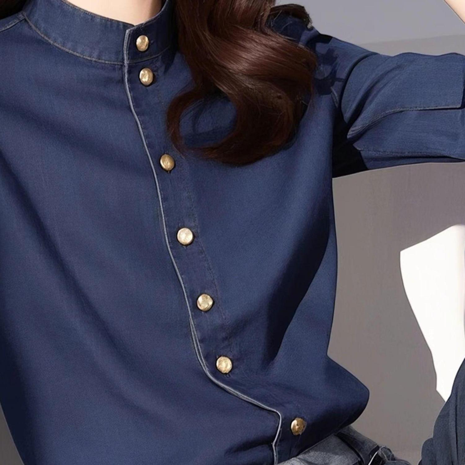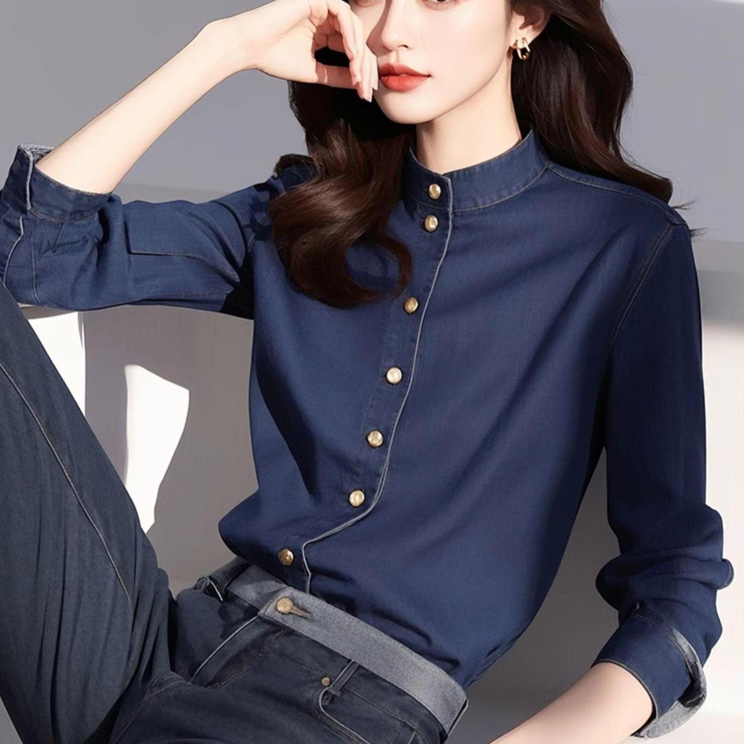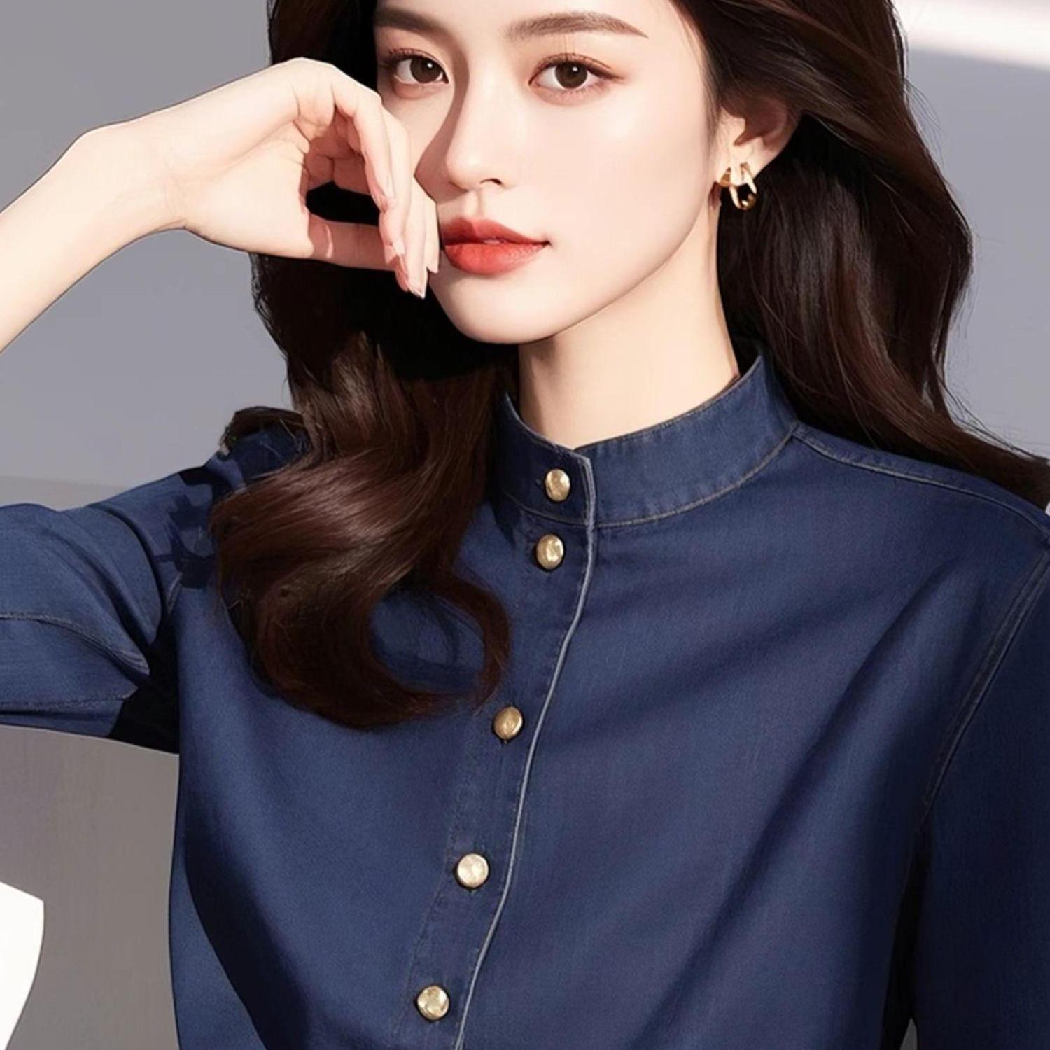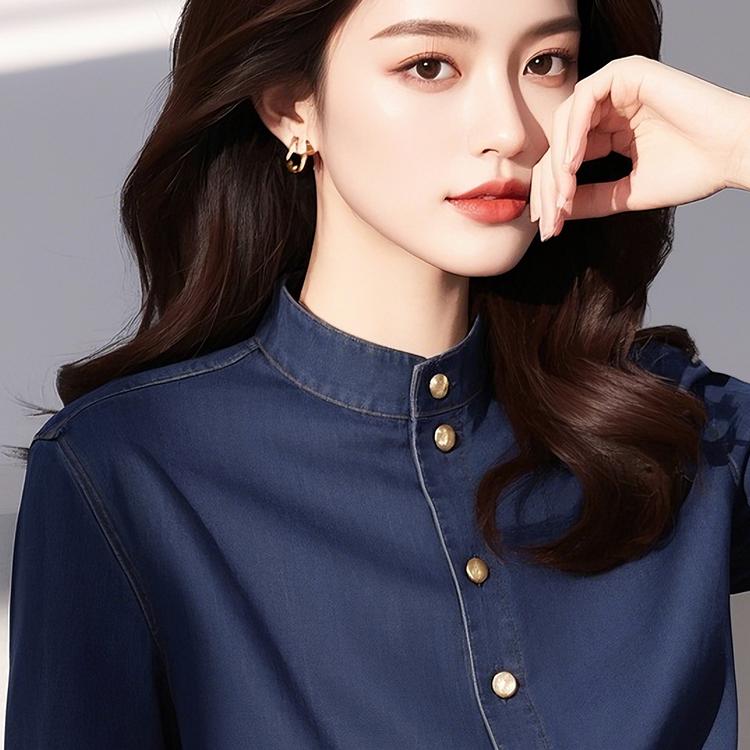 专柜撤回漂亮小衫洋气别致小众轻奢高级感通勤蓝色牛仔叠穿衬衫春