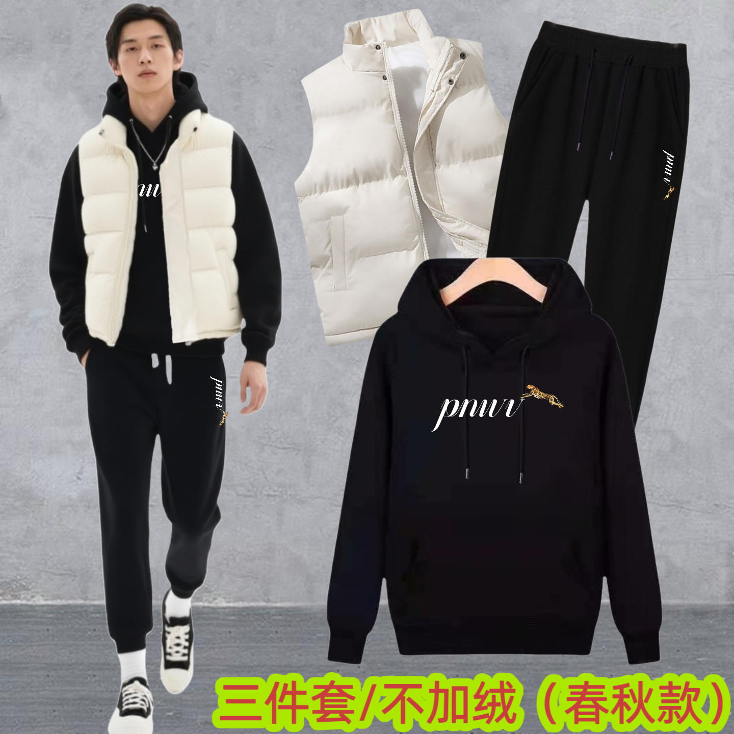 运动套装男士秋冬季时尚印花加绒连帽卫衣休闲长裤马甲三件套男款