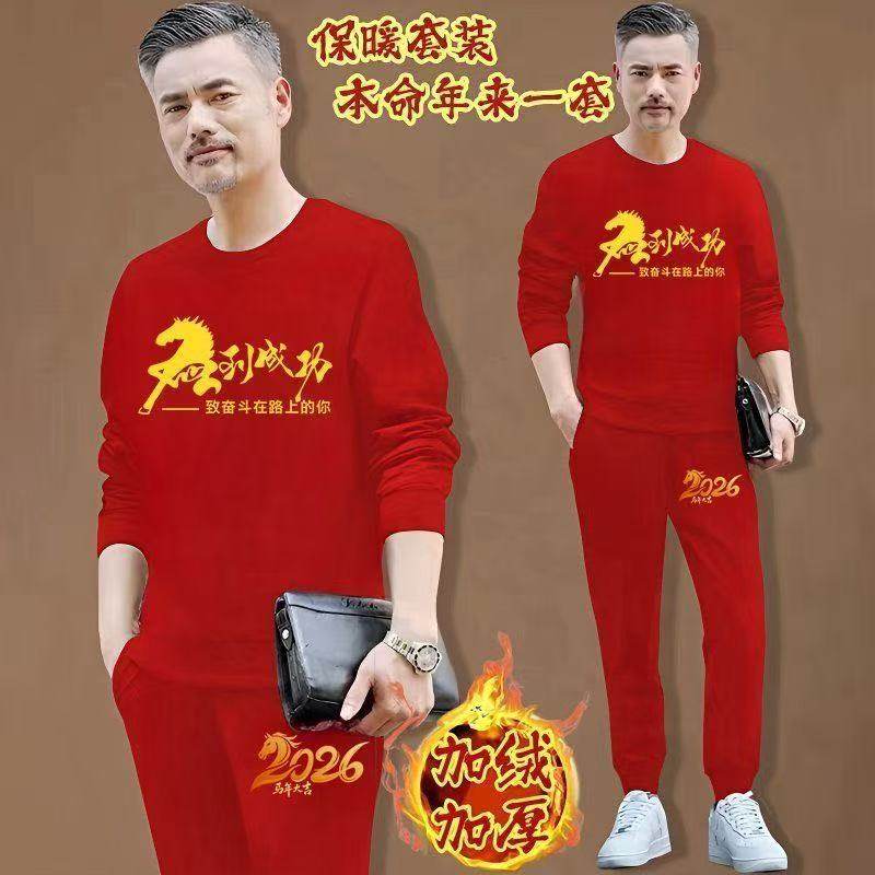 马年本命年套装大红色德绒秋衣秋裤男士加绒中老年保暖内衣马年