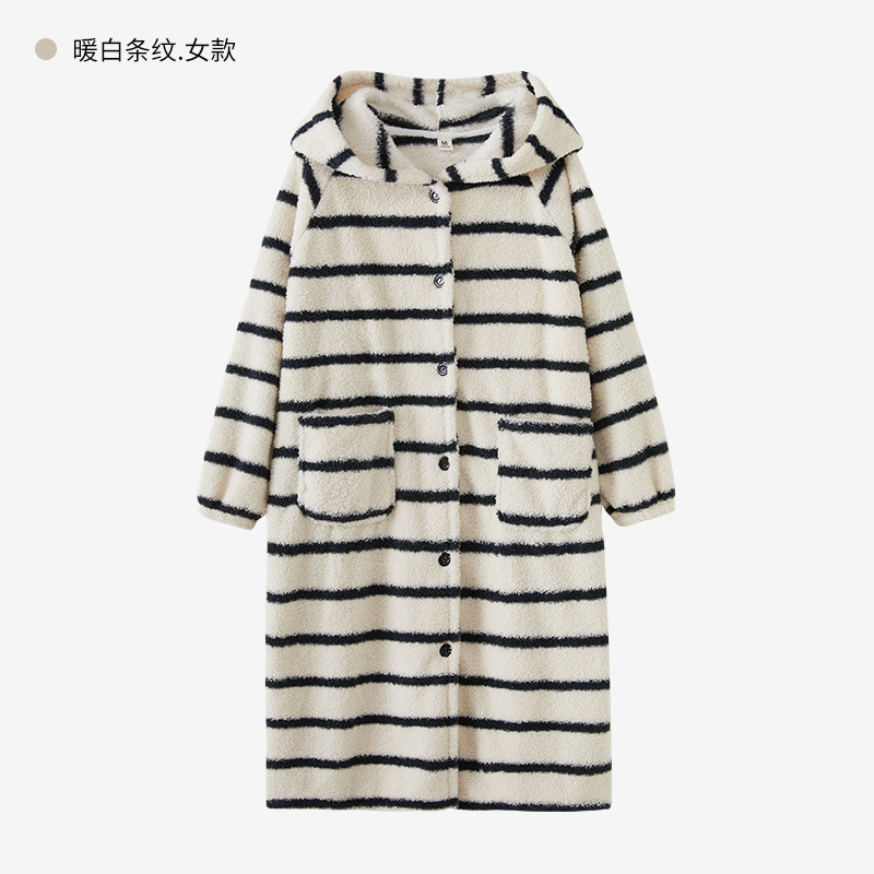 珊瑚绒连帽睡袍女秋冬季保暖加厚半边绒中长款大码条纹休闲家居服