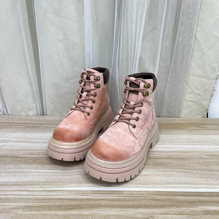 外面原单女靴真皮微瑕圆头纯色厚底粗跟系带短靴时尚户外登山靴