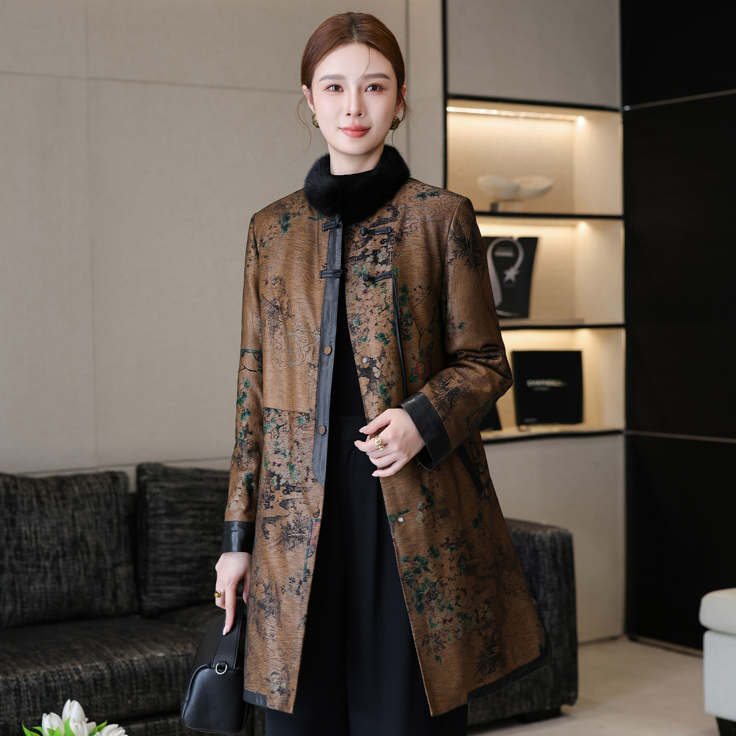 真皮羽绒服皮衣女2025秋冬新款水貂领复古印花绵羊皮外套中长大码