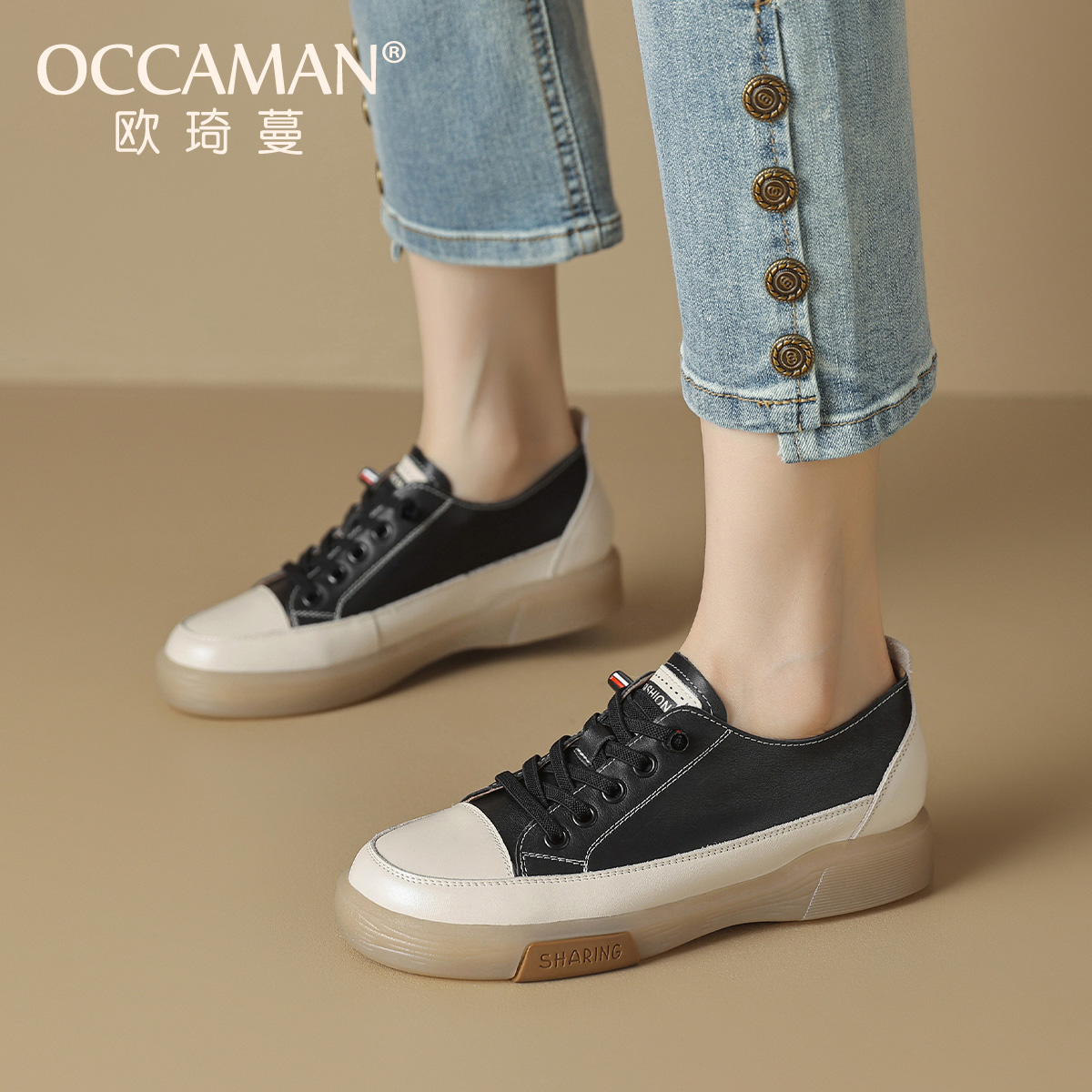 OCCAMAN/欧琦蔓小白鞋女2025春夏新款真皮休闲鞋轻便免系带板鞋