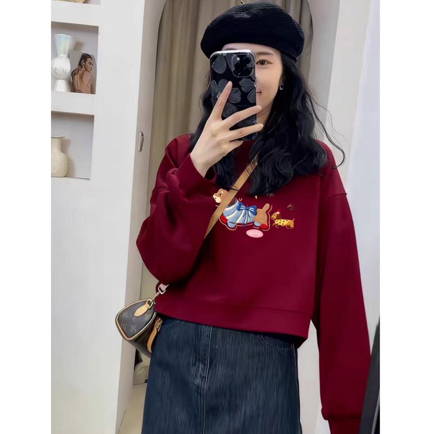韩版趣味卡通小狗本命年酒红色短款卫衣女秋冬季保暖加绒圆领上衣