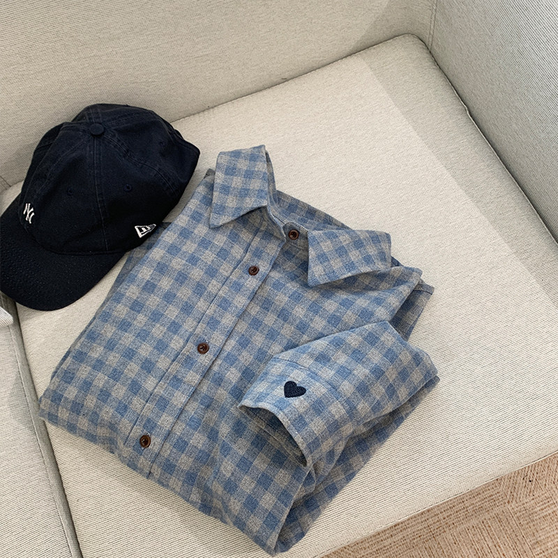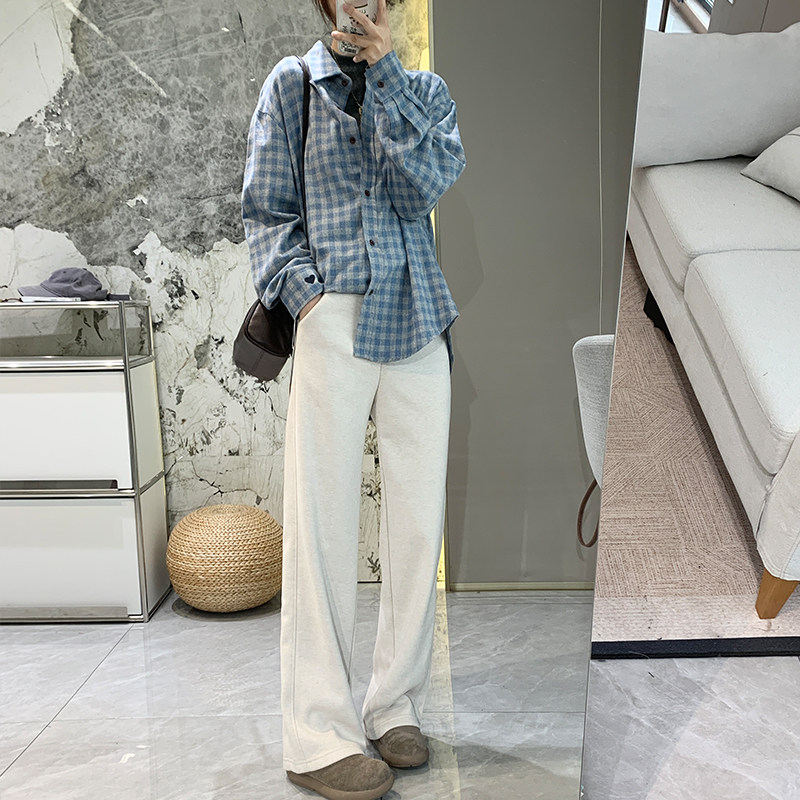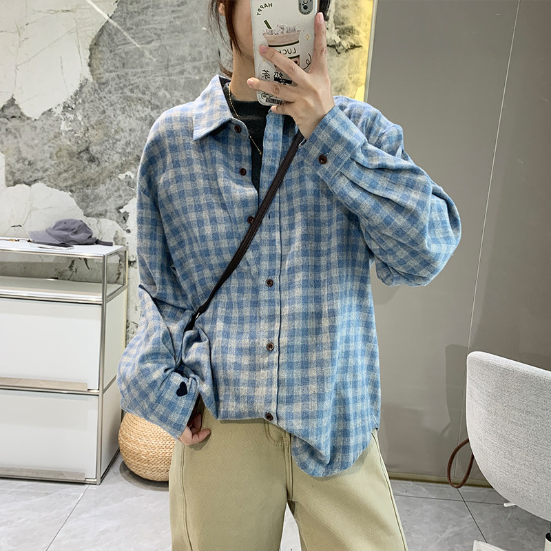 显白复古格纹韩版磨毛加厚长袖衬衫女秋冬宽松显瘦叠穿衬衣上衣