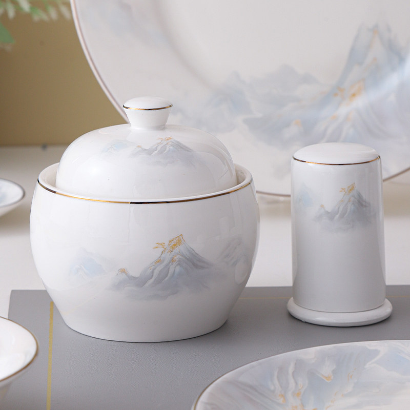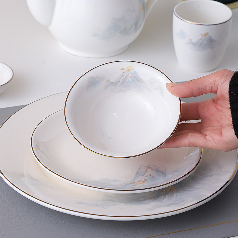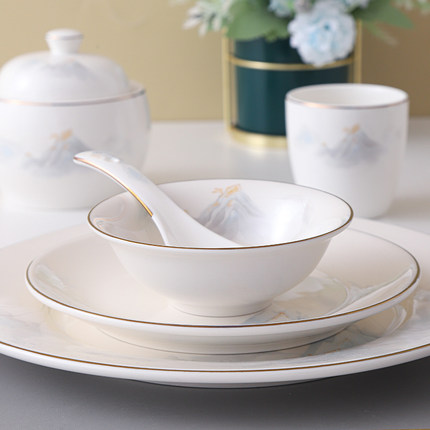 中式摆台碗碟套装家用轻奢金边瓷器餐具风景日照生紫烟商用一人装