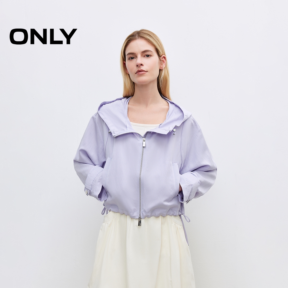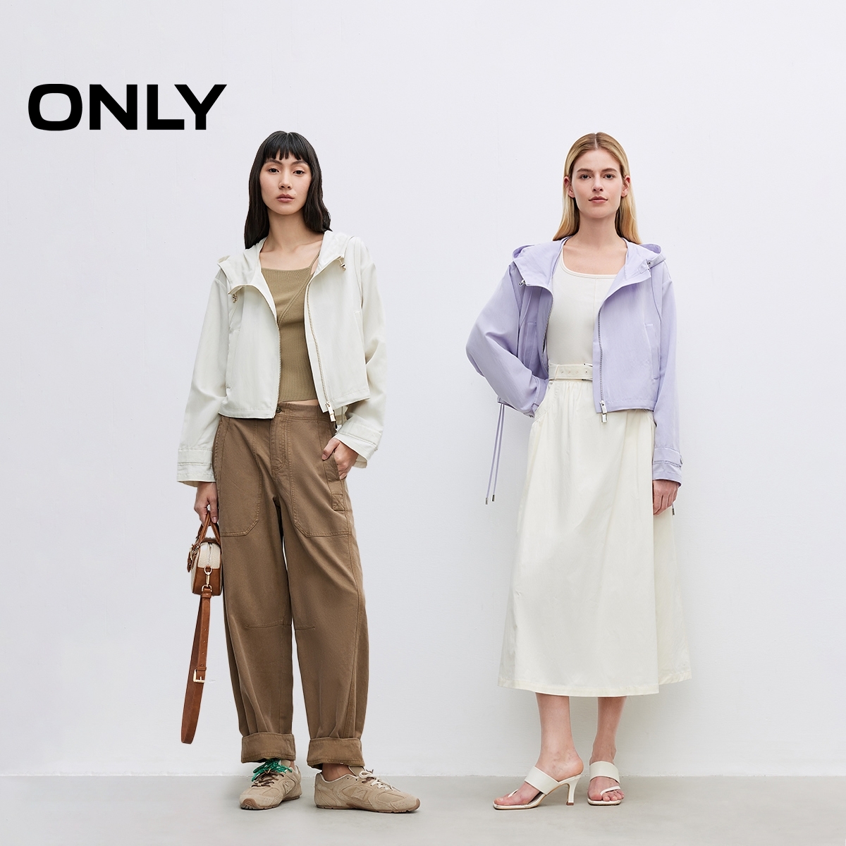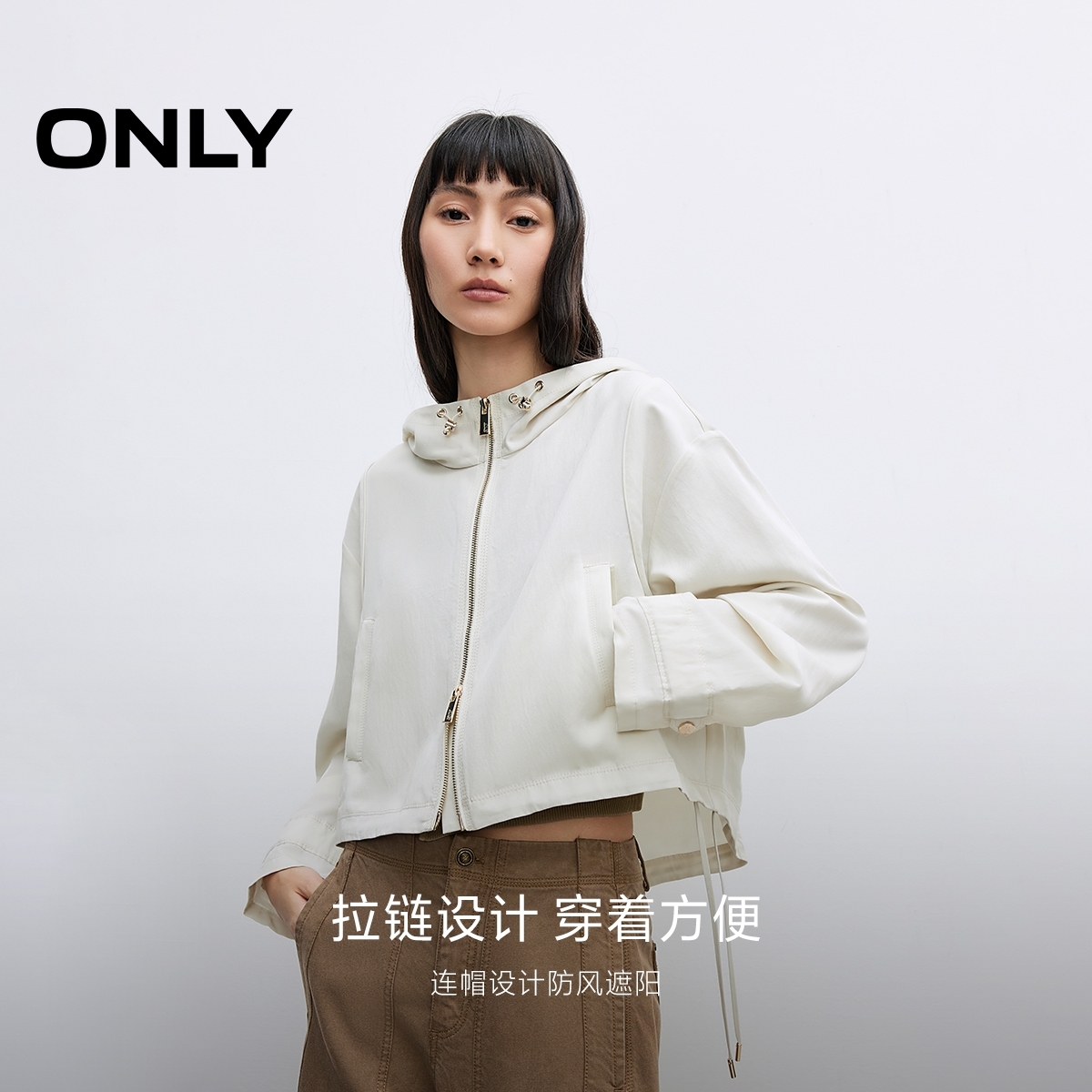 ONLY2025秋季新款纯色连帽实用双向拉链落肩宽松开衫风衣外套女