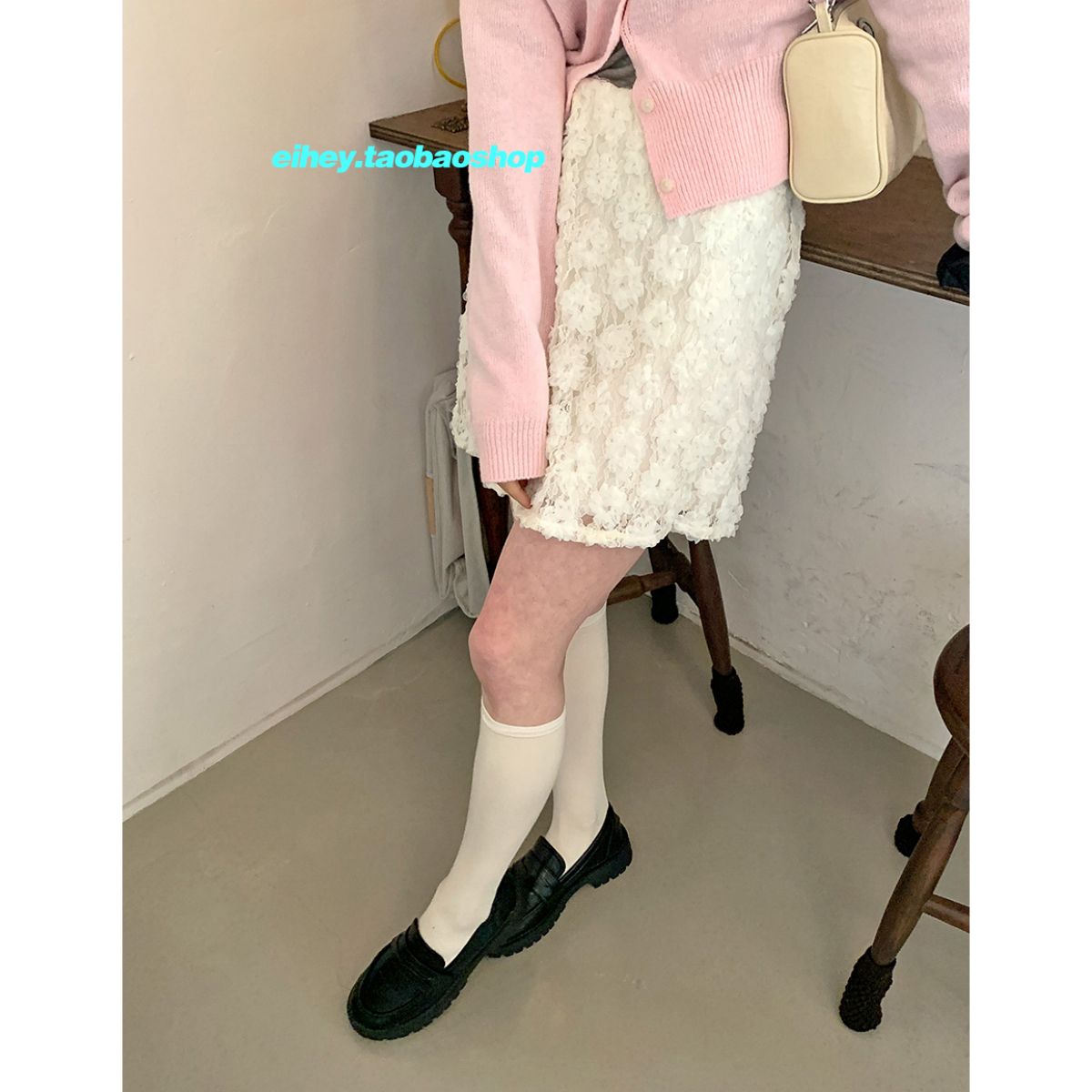 eihey诶嘿新款温柔甜美蕾丝立体花朵淑女弹力腰垂坠感短裙半身裙