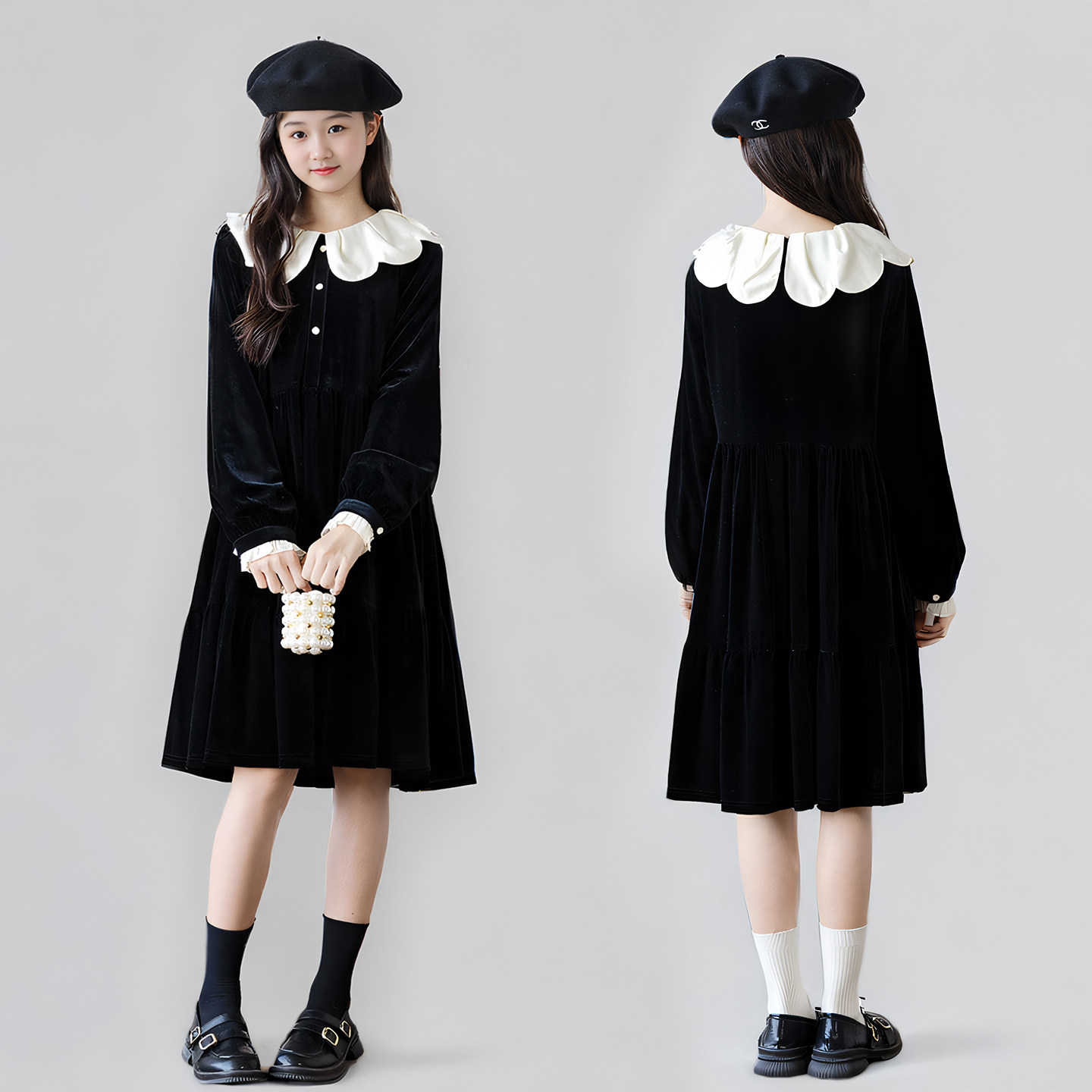 韩版女童洋气宽松黑色丝绒连衣裙