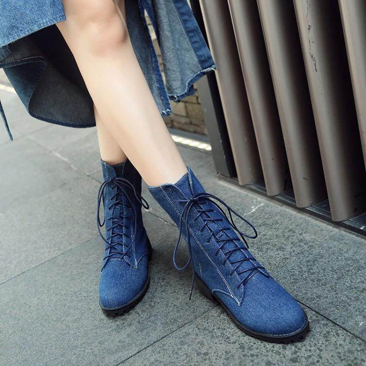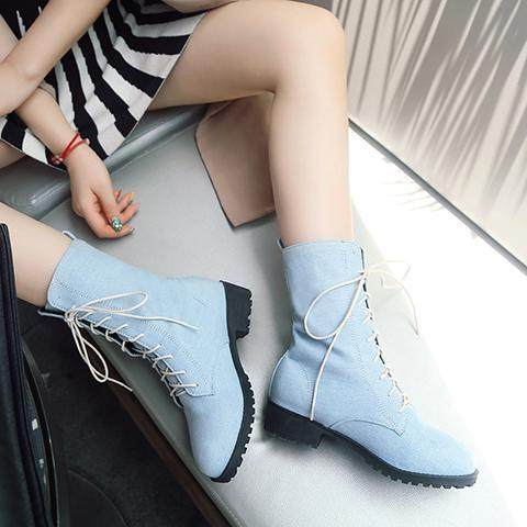 33小码系带浅蓝色平底马丁靴大码反串伪娘牛仔深蓝短靴女cosplay