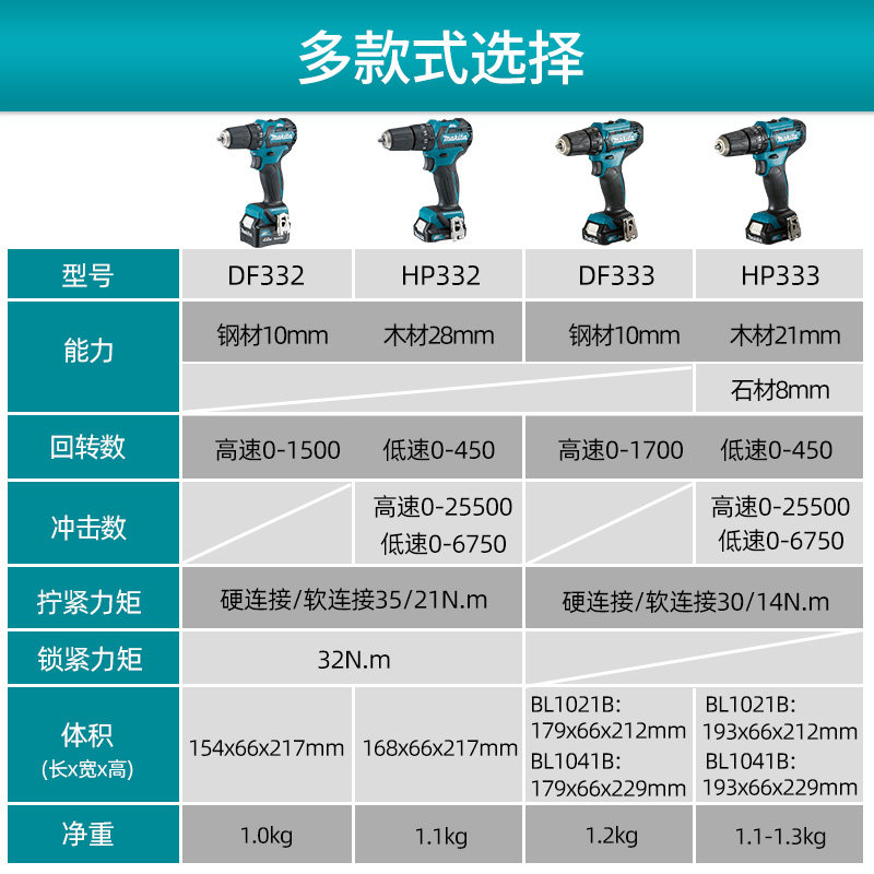 牧田充电手钻DF333手电钻螺丝刀冲击钻HP332家用12V锂电动工具