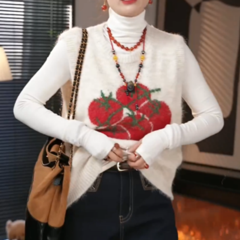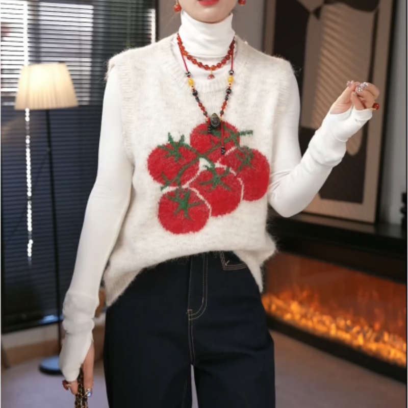 韩系新款番茄温柔无袖针织马甲背心+慵懒风高领打底衫女两件套装