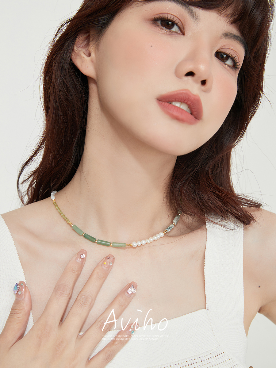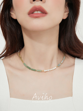 aviho 釉玉山河 天然玉石拼接珍珠项链复古国潮气质高级感锁骨链