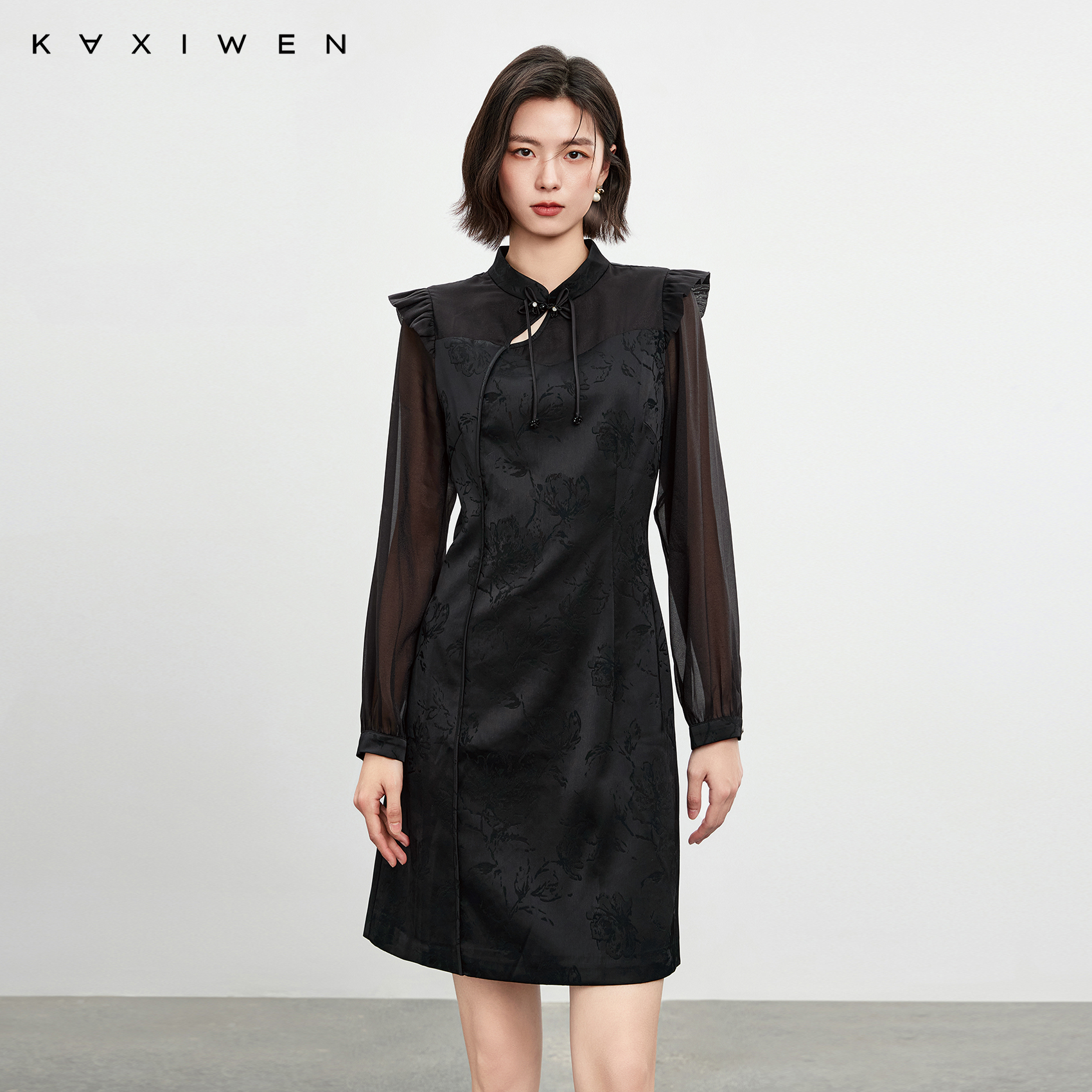 佧茜文国风镂空盘扣连衣裙2025春季新款黑色重工提花气质裙子女