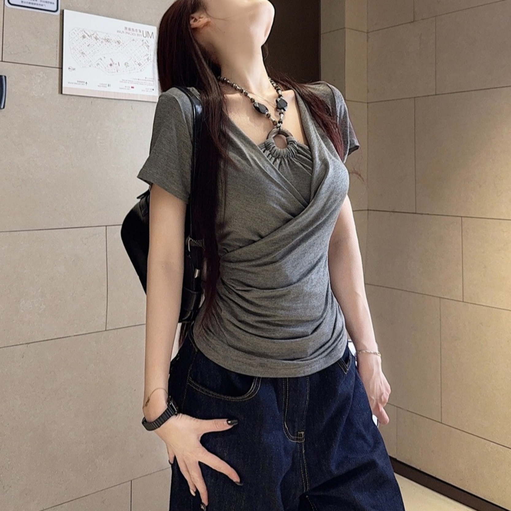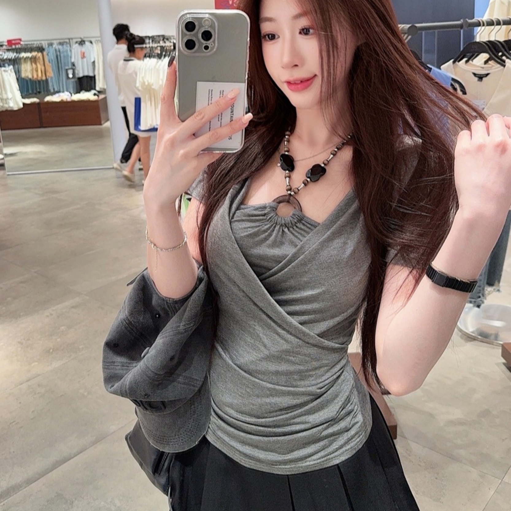 复古气质假两件短袖法式T恤女春秋内搭打底夏季修身收腰挂脖上衣