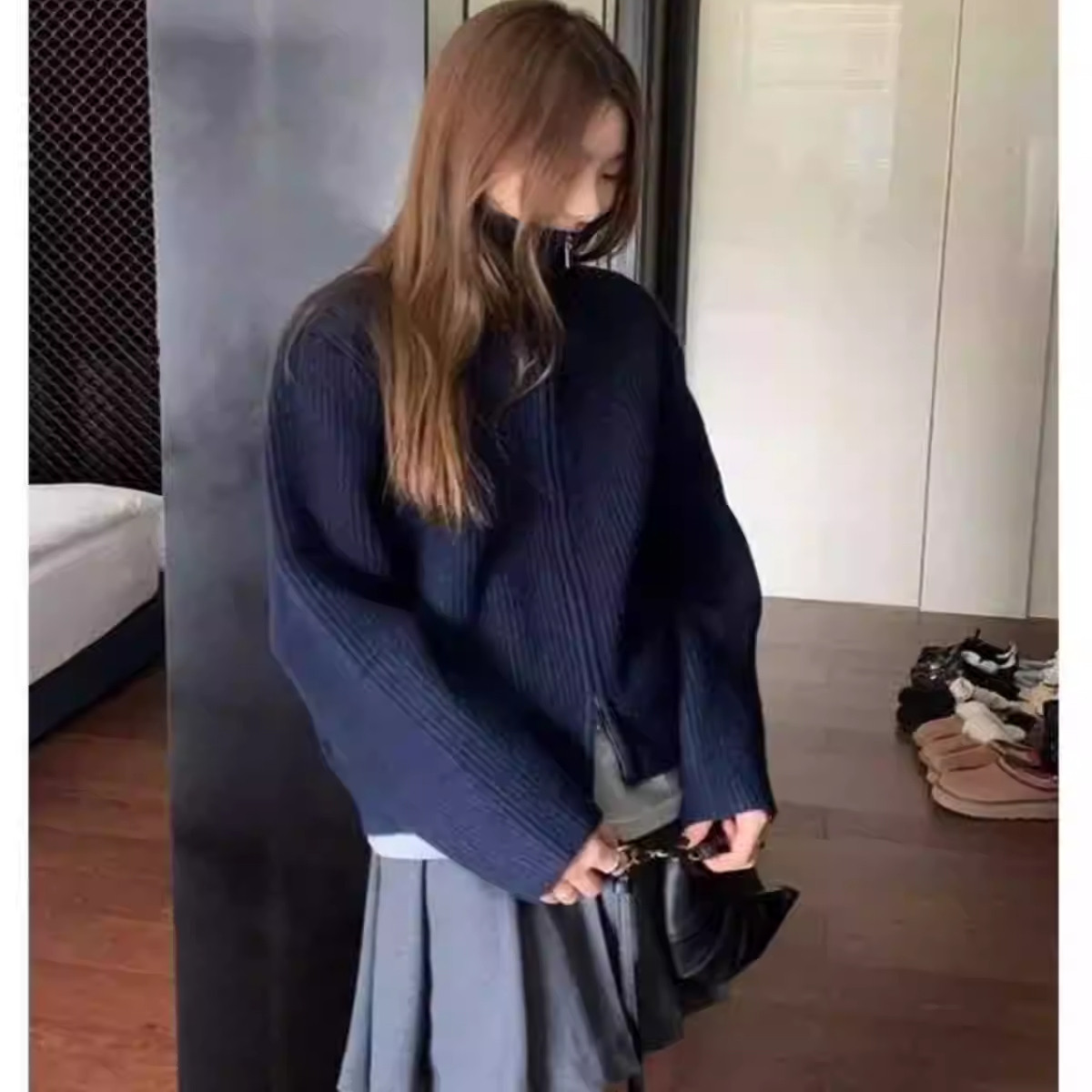 秋季新款灰色双拉链高领针织衫女纯色山羊绒开衫加厚百搭毛衣外套
