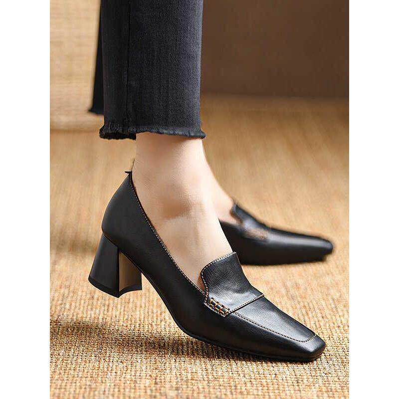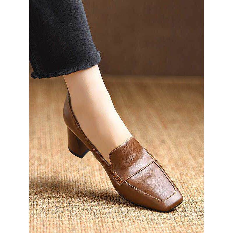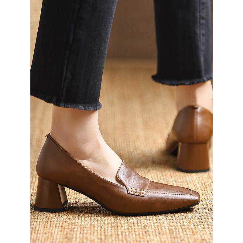 真皮棕色高跟乐福鞋女夏季2025新款英伦小皮鞋一脚蹬方头粗跟单鞋