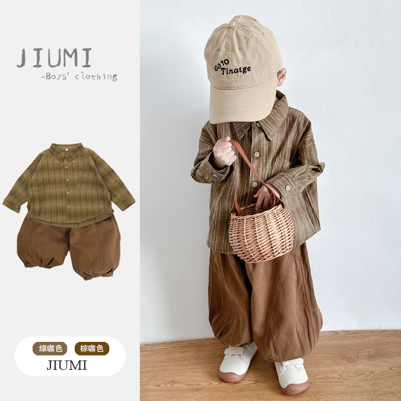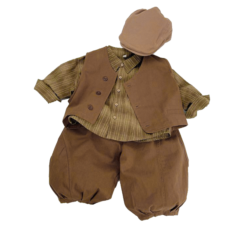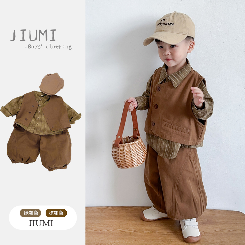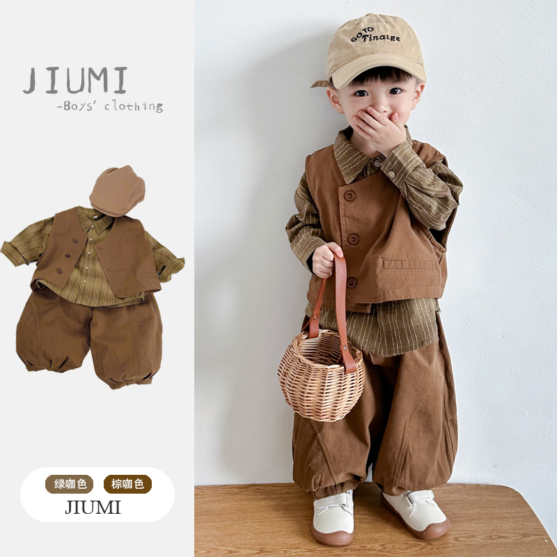男童秋装2025秋季新款儿童韩版条纹衬衫男宝宝复古马甲灯笼裤套装