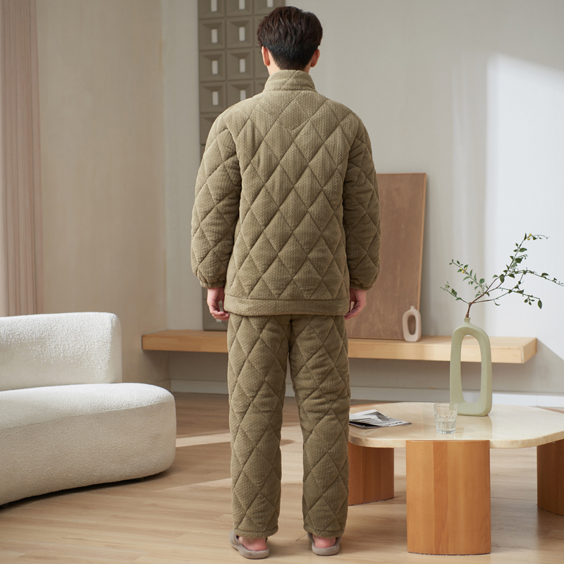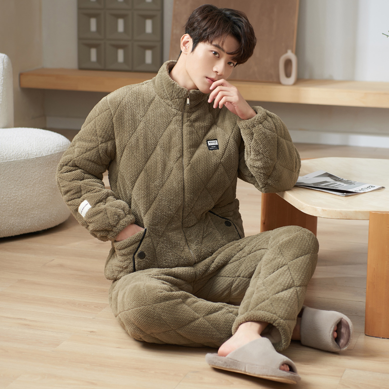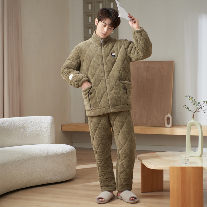 男士睡衣秋冬季加厚加绒珊瑚绒三层夹棉袄可外穿法兰绒家居服套装