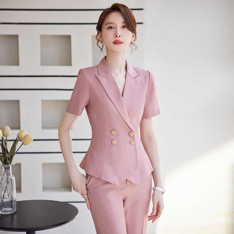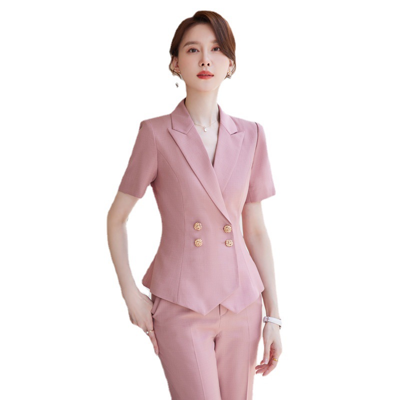粉色职业女西装套装夏季短袖洋气时尚珠宝店前台主持人上班工作服