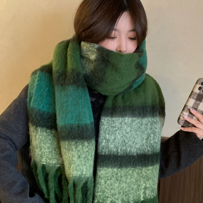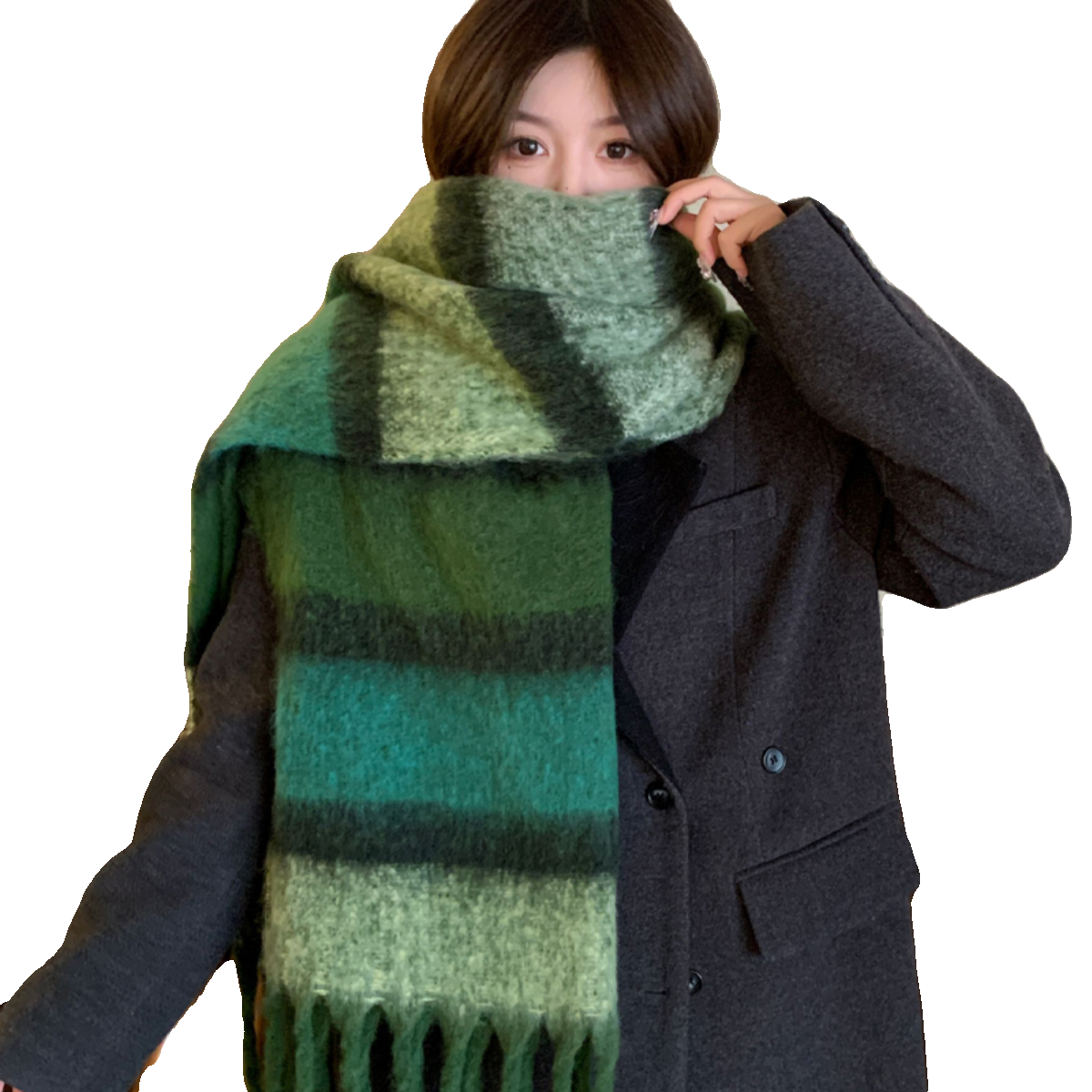 新款高级感马海毛围巾女冬季森林绿百搭格子披肩两用情侣保暖围脖