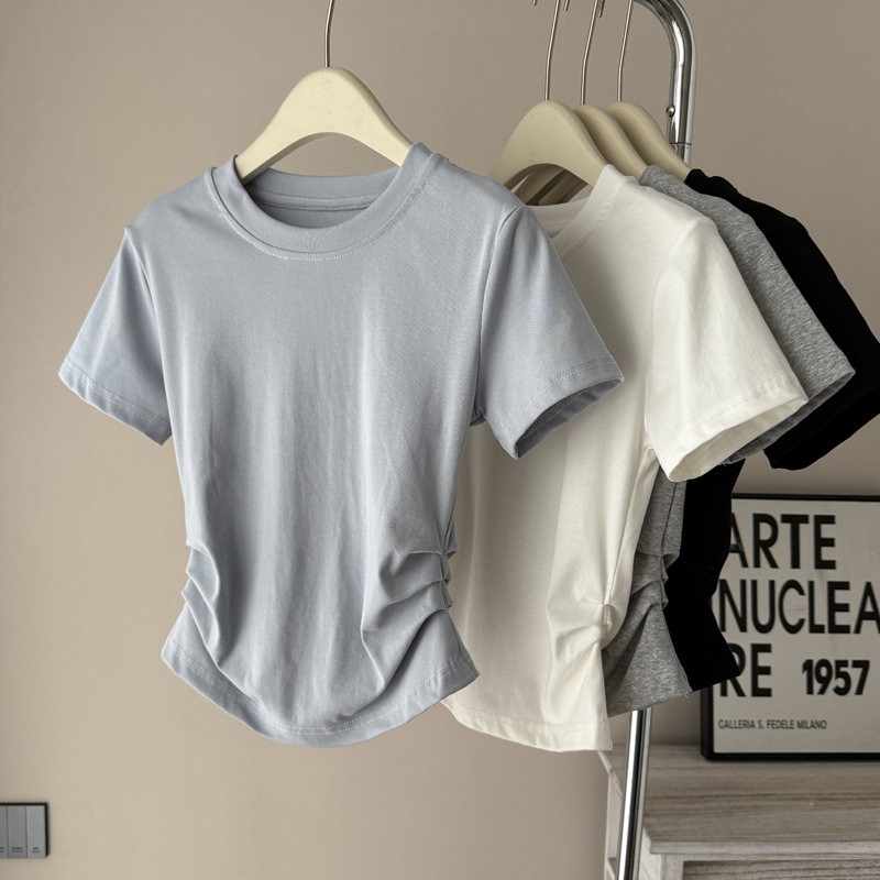 白色正肩短袖T恤女夏季2025新款修身韩版打底衫短款褶皱掐腰上衣