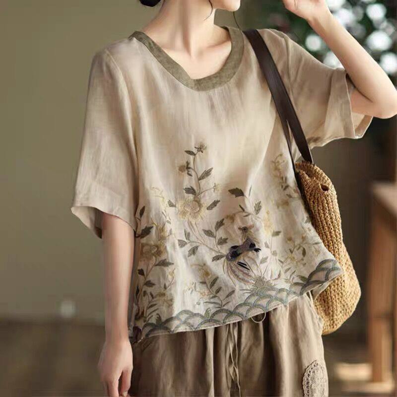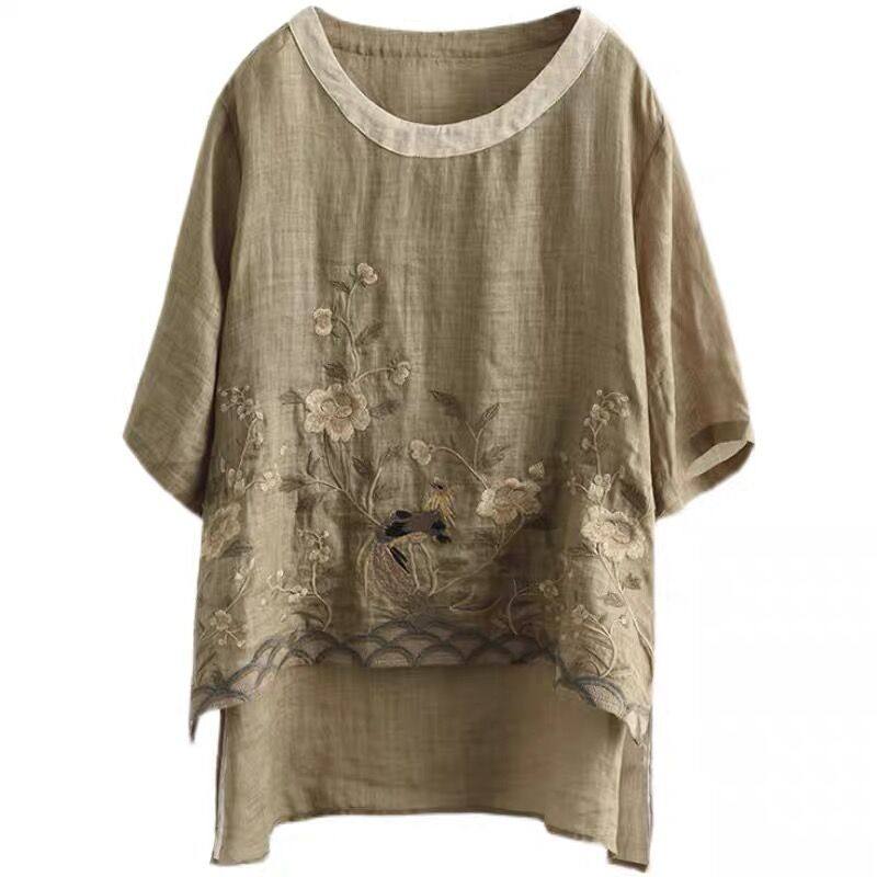 中年妈妈棉麻短袖T恤女士宽松2025夏季新款高端亚麻苎麻大码上衣