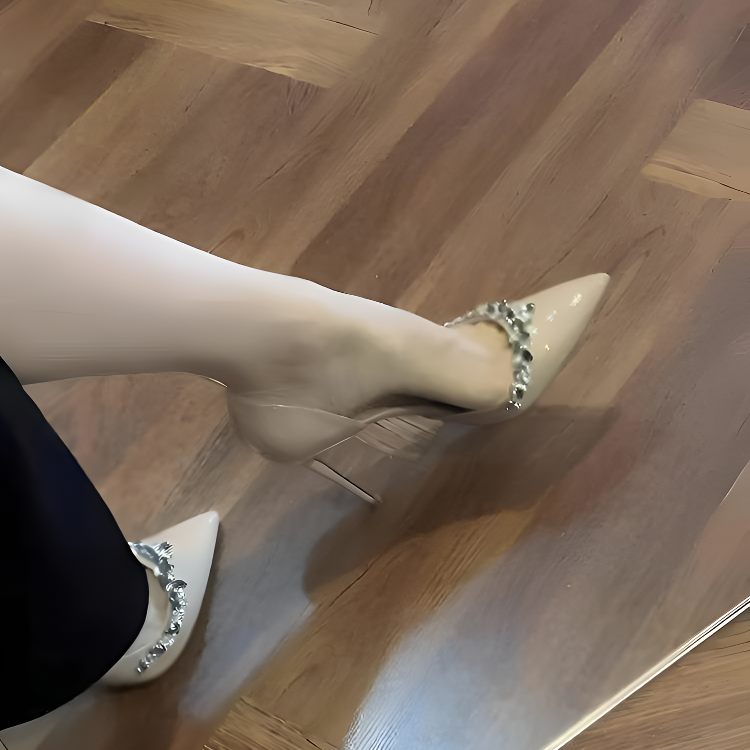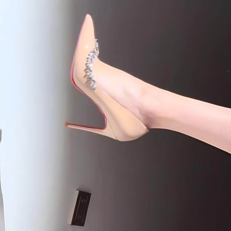 2025年春新款尖头裸色高跟鞋女性感绝美细跟水钻链条红底侧空单鞋