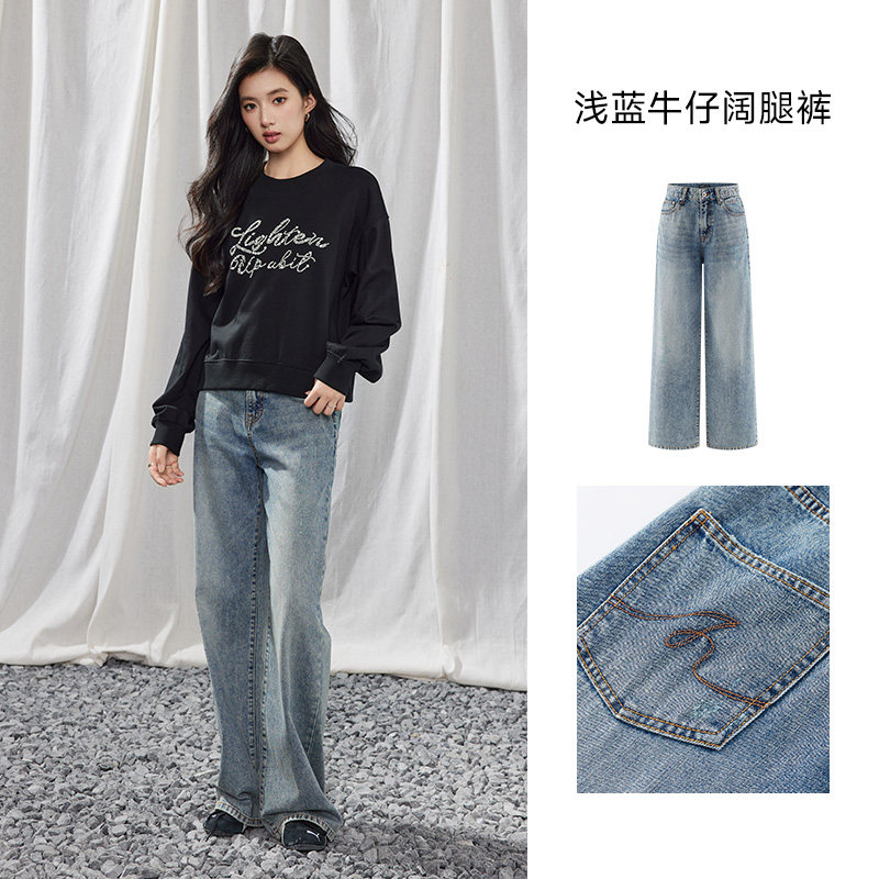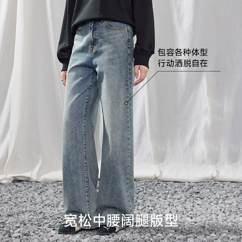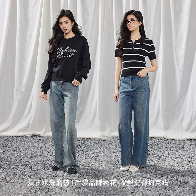 A21女装水洗磨破牛仔裤无弹长裤宽松阔腿裤