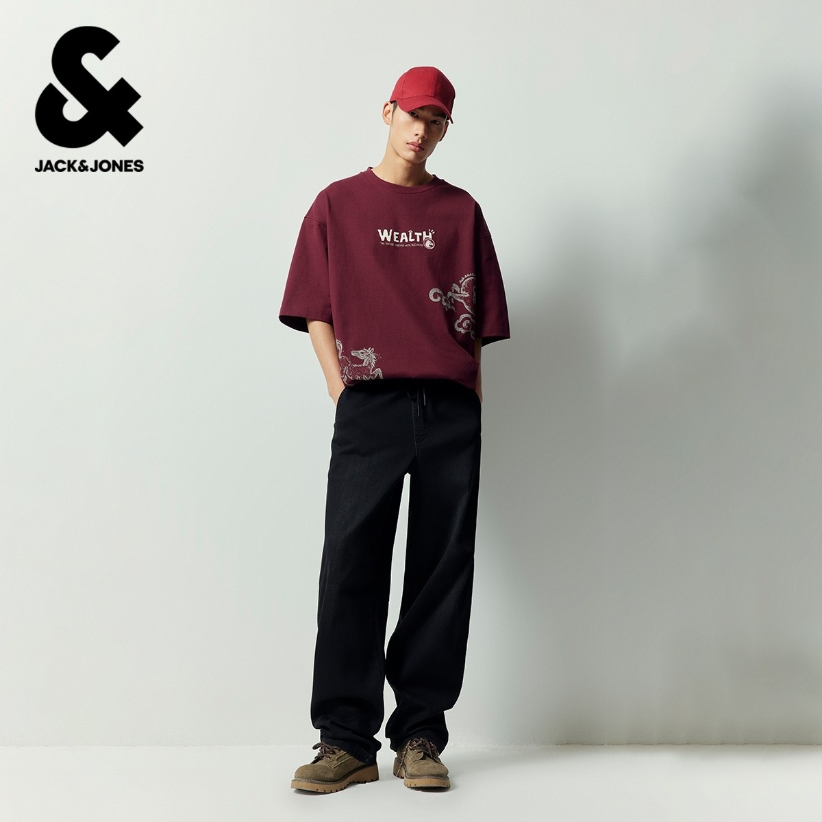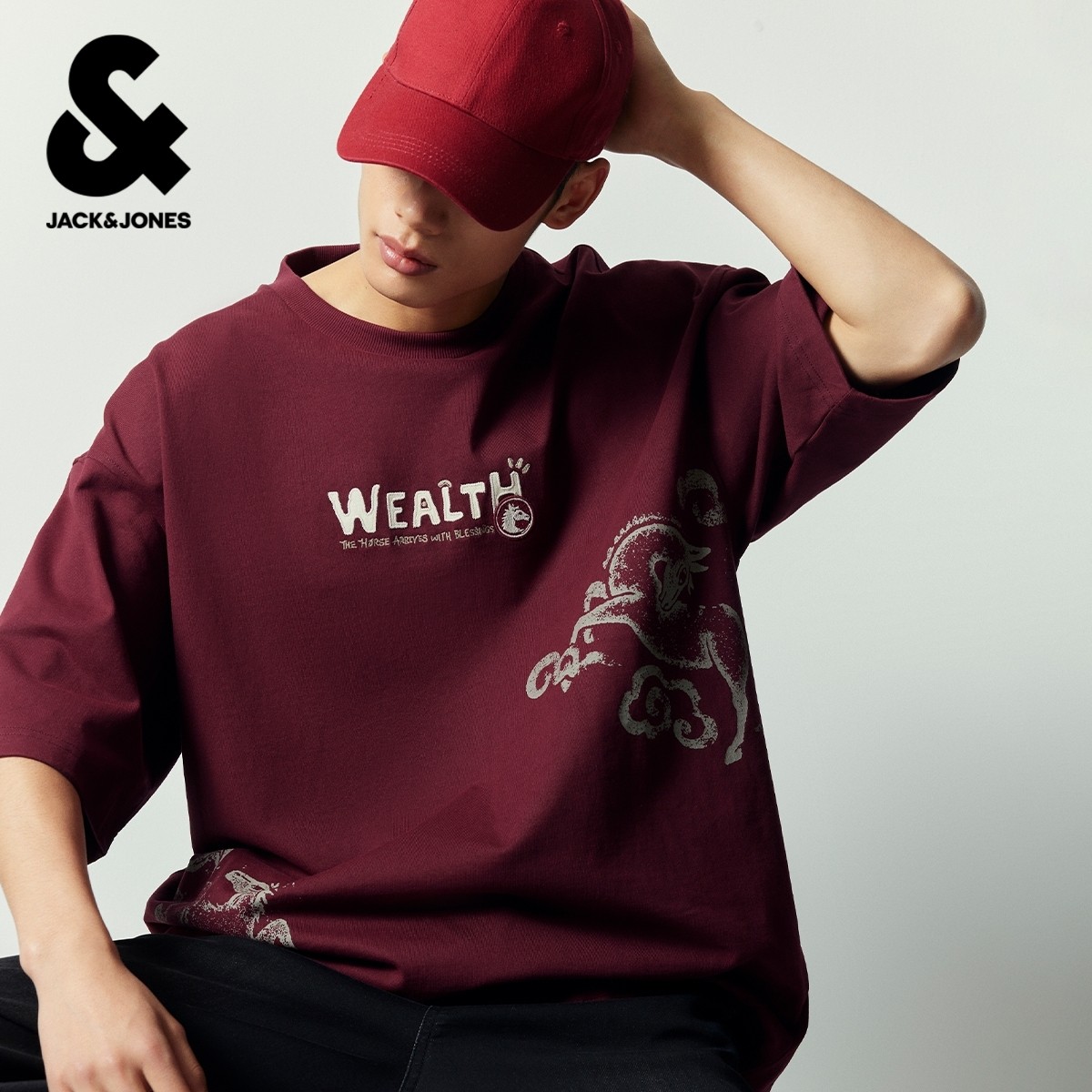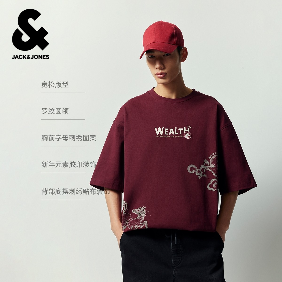 【马年新年款】杰克琼斯男装春季红色棉休闲宽松圆领短袖T恤本命
