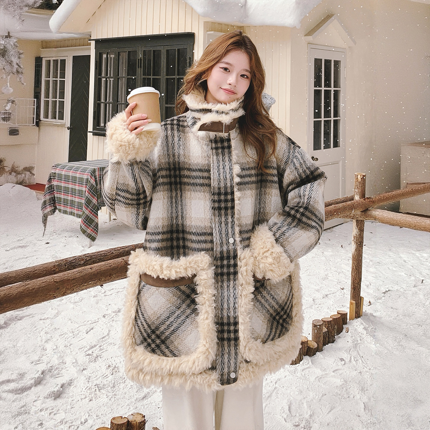 大码女装羊羔毛格纹拼接设计加厚棉服女胖mm时尚百搭宽松保暖外套