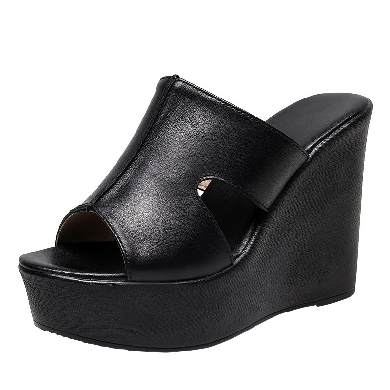真皮坡跟拖鞋女夏镂空一字拖试衣间防滑高跟厚底鱼嘴室外穿凉拖鞋