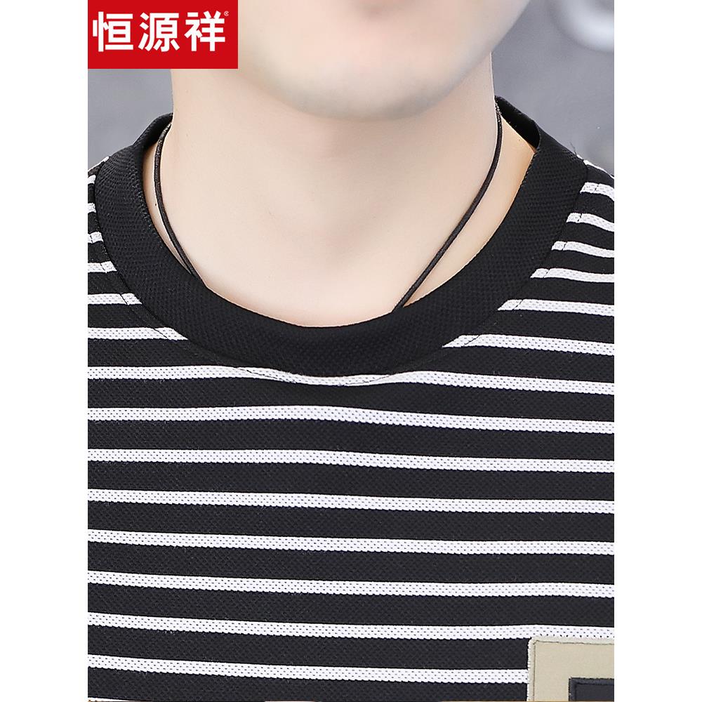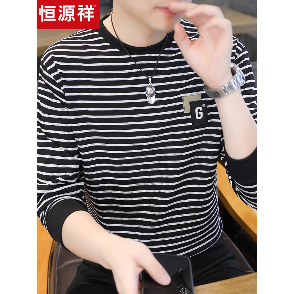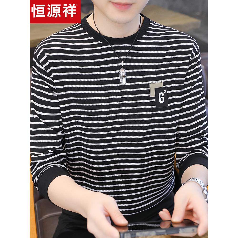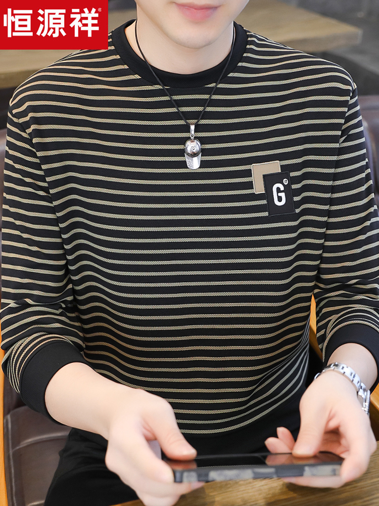 恒源祥春秋季新款高端卫衣男休闲圆领长袖T恤男士条纹薄款打底衫T