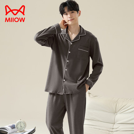 猫人纯棉长袖睡衣男春夏2024年新款男士家居服翻领薄款可外穿套装