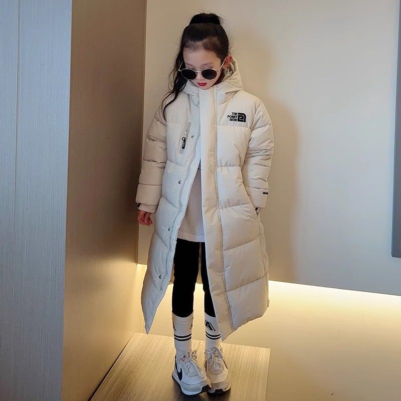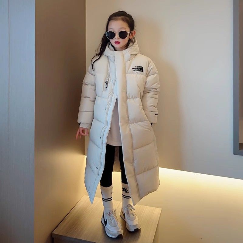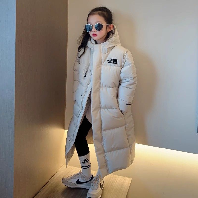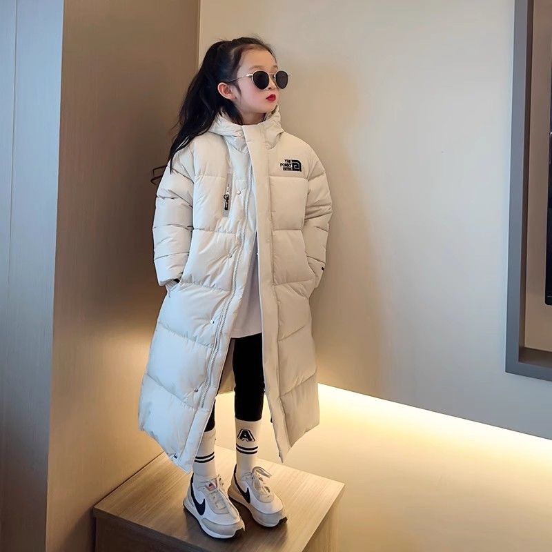 女童冬季纯色长款连帽羽绒棉服2025新款中大童防风保暖冬装外套潮
